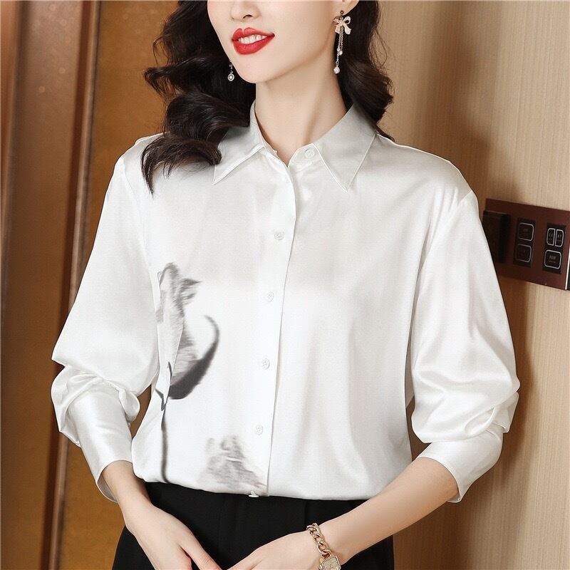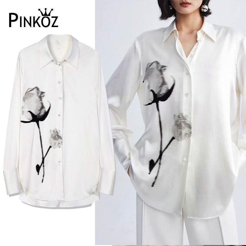 Pinkoz 夏夜白水墨画バラ花プリントターンダウン襟ルーズ白シャツファムエレガント traf ブラウストップ ピンク ホワイト サマー 夏物 フェミニン フラワーデザイン