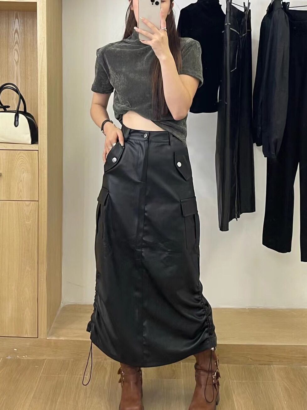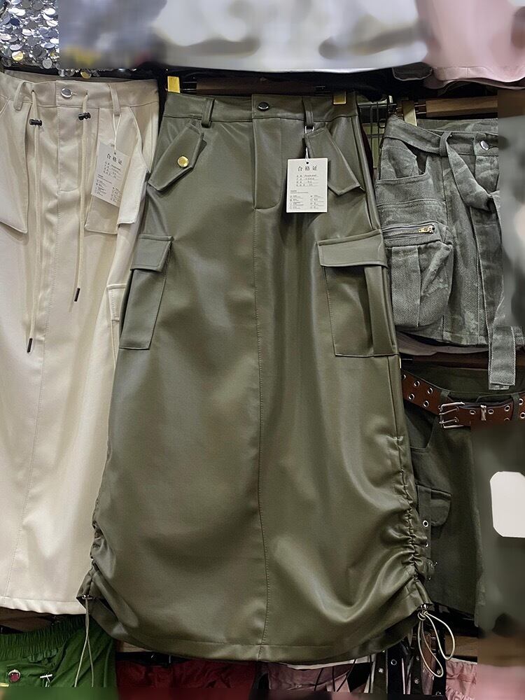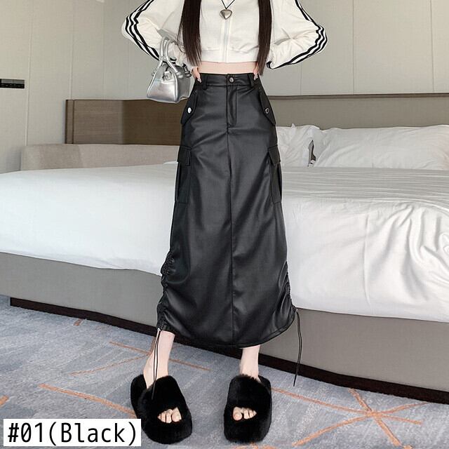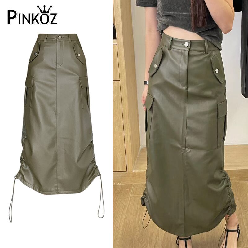Pinkoz カジュアルストリート PU レザーグレンミディスカートポケット春秋ファッションシックロングスカートドローストリングヴィンテージ ピンク スプリング 春物 オータム 秋物 ビンテージ