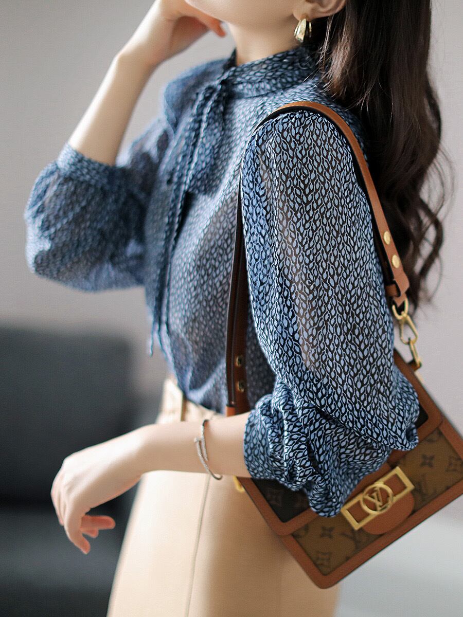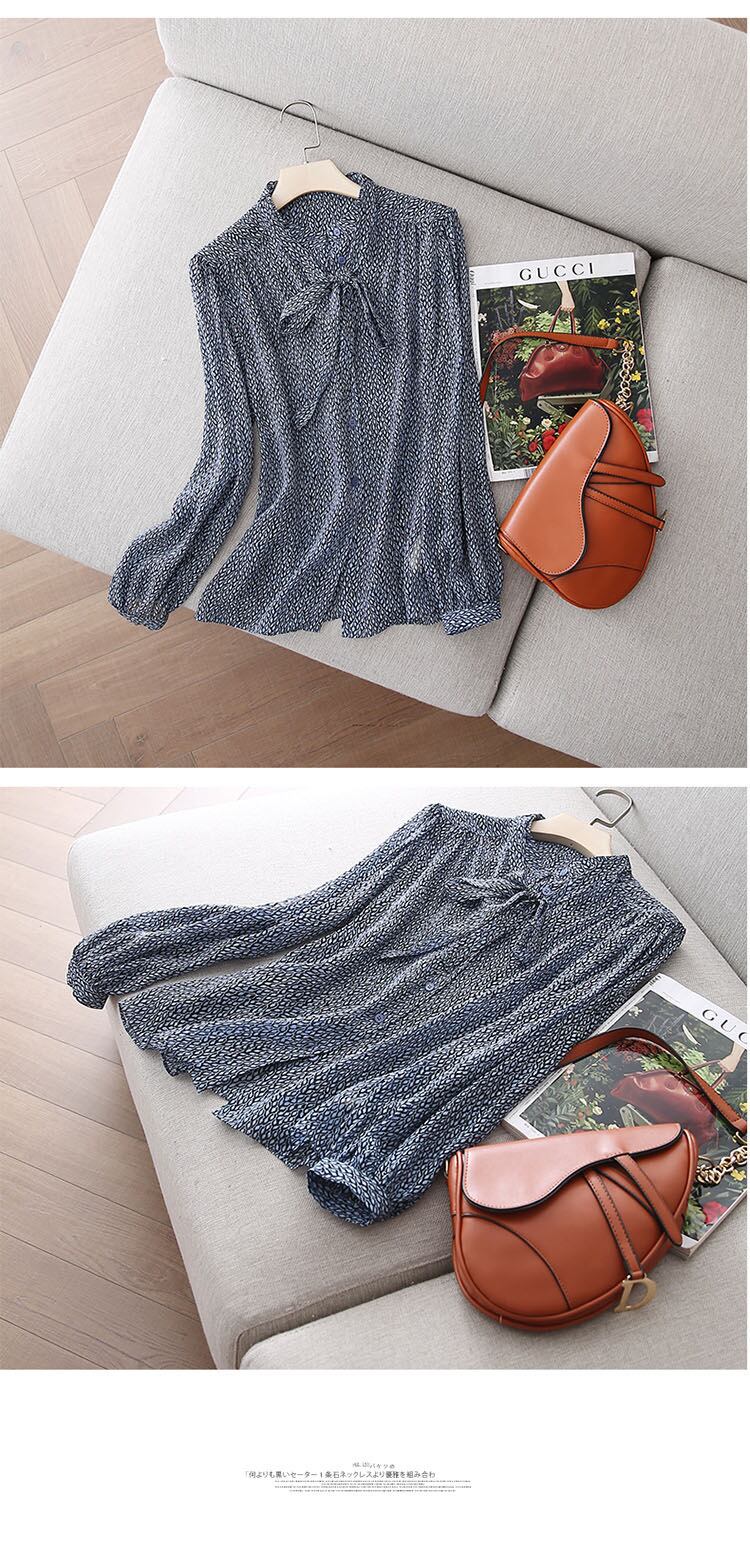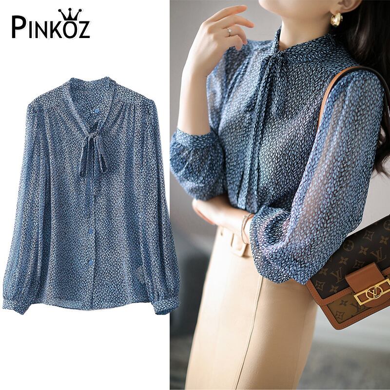 Pinkoz 夏ブルー花柄シフォンエレガント弓襟ルーズブラウスフルスリーブ春シャツ作業服ストリートヴィンテージ ピンク リボン スプリング 春物 サマー 夏物 ビンテージ
