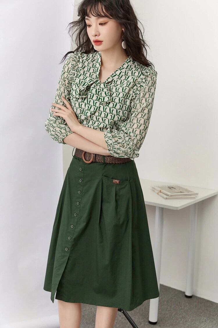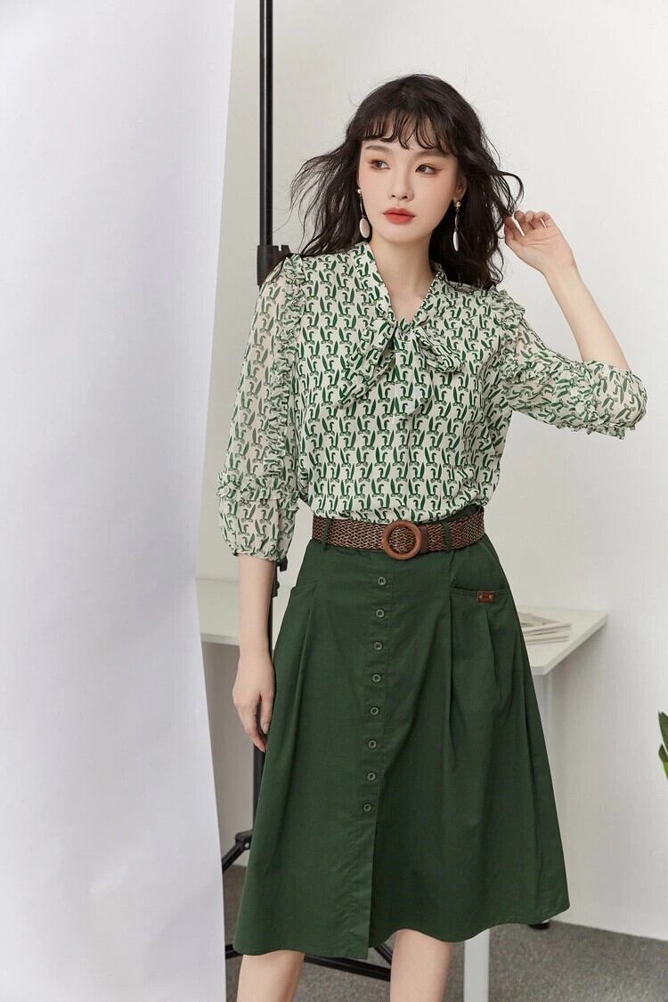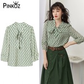 Pinkoz 滑走路デザイナー滑走路グリーン花柄弓襟半袖シフォンブラウスシャツヴィンテージファッショントップス za ピンク リボン ハーフスリーブ ビンテージ