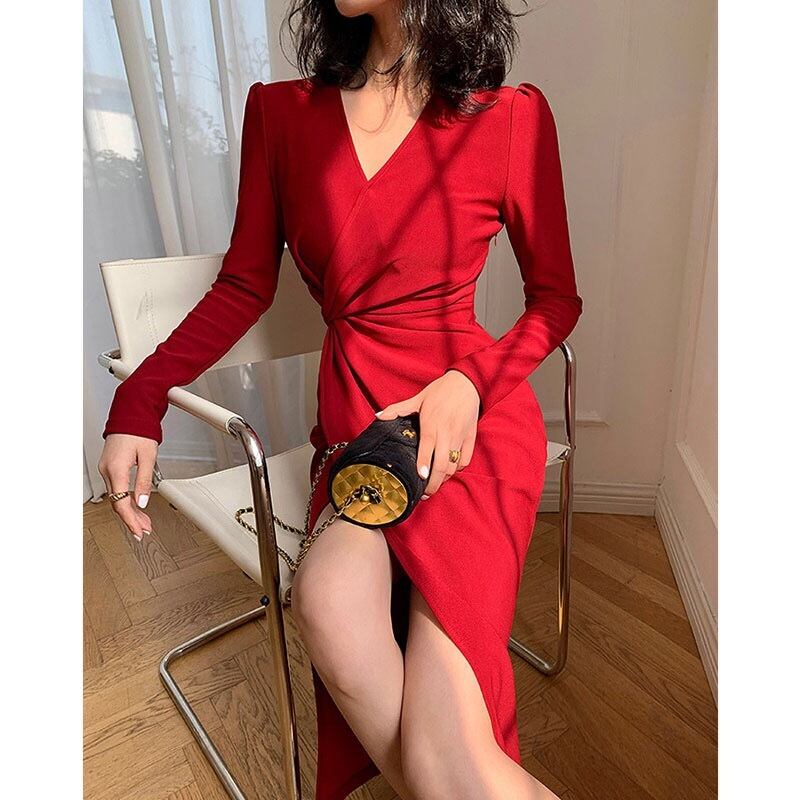 Pinkoz クリスマスレッド v ネックシャーリングペンシルスプリット秋冬ミディドレスファッションエレガントシックローブデムジェヴィンテージ ピンク オータム 秋物 ウィンター 冬物 Vネック ビンテージ