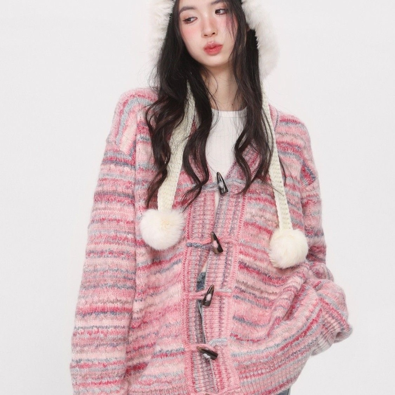 Pinkoz ピンク v ネックニットカーディガン 2024 秋冬ピンクストライプルーズカジュアルストリートファムセーターボタン za オータム 秋物 ウィンター 冬物 Vネック フェミニン