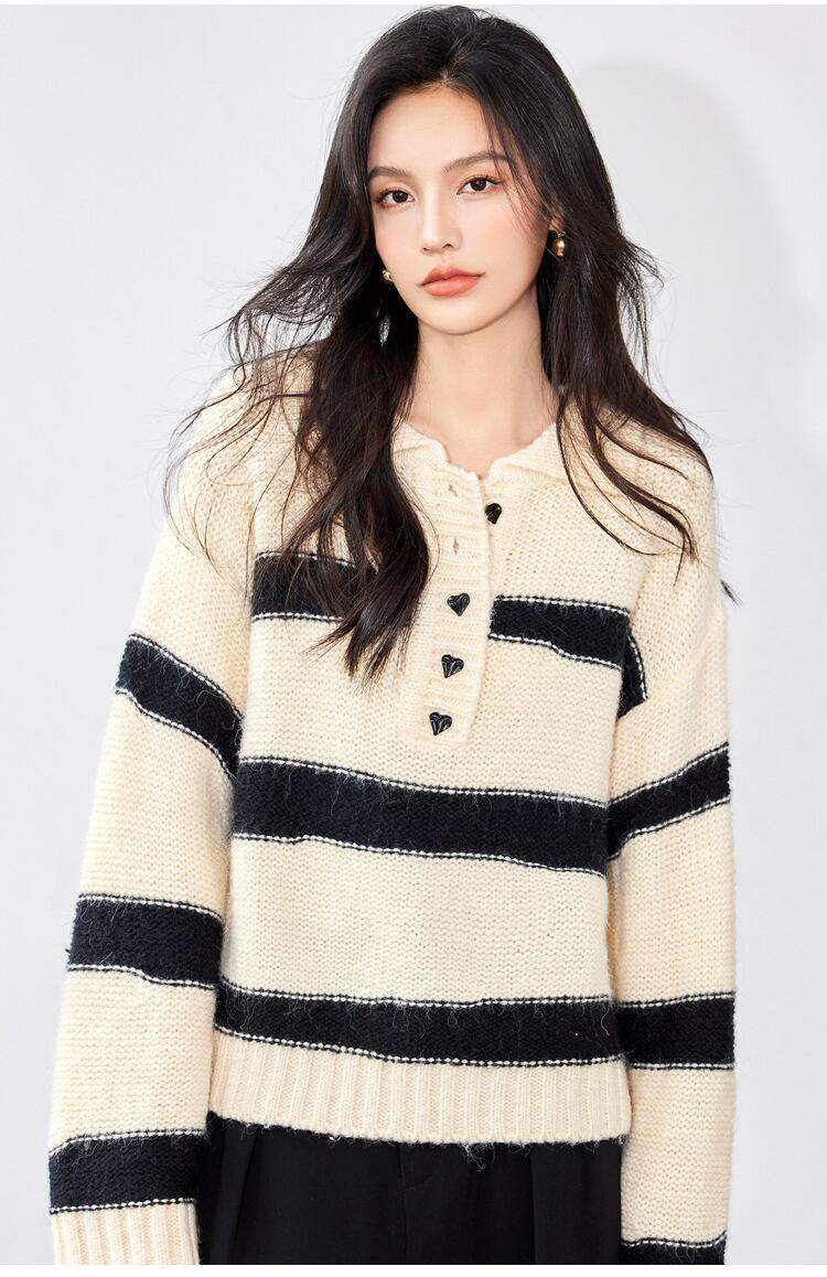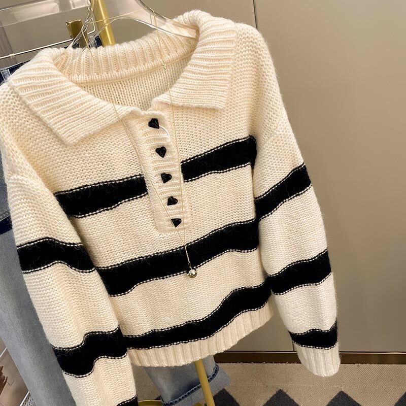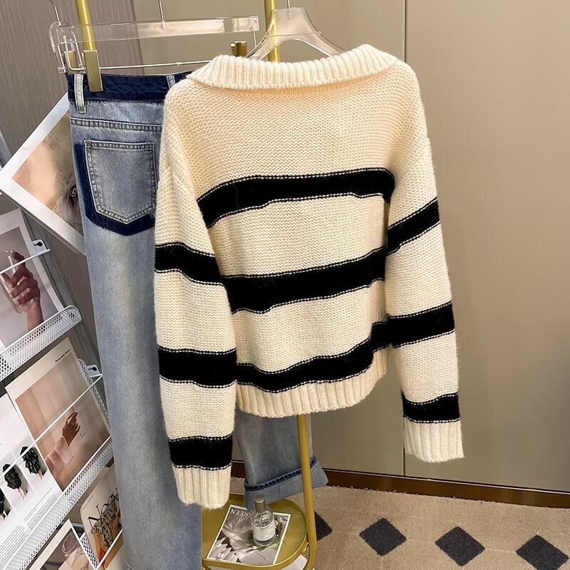 Pinkoz ハイストリート服ターンダウン襟ルーズセレブスタイリッシュベージュストライプルーズセーターニットトップスヴィンテージシック볼레로 ピンク ビンテージ