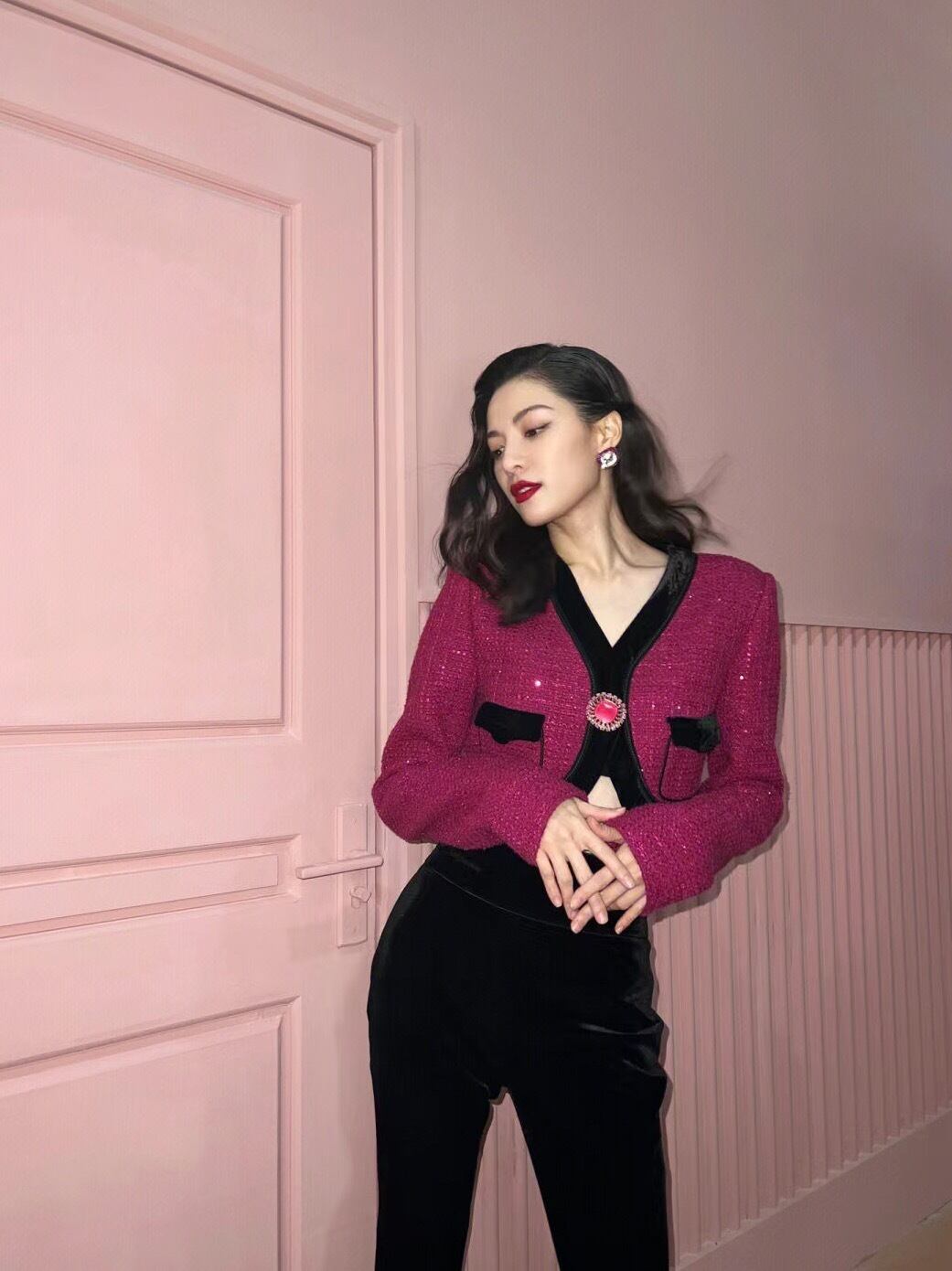 Pinkoz 滑走路デザイナーショートパープル v ネックジャケット高級 1 ボタン赤パッチワーク秋冬オーバーコートデジュメールフェスティバル ピンク レッド オータム 秋物 ウィンター 冬物 Vネック