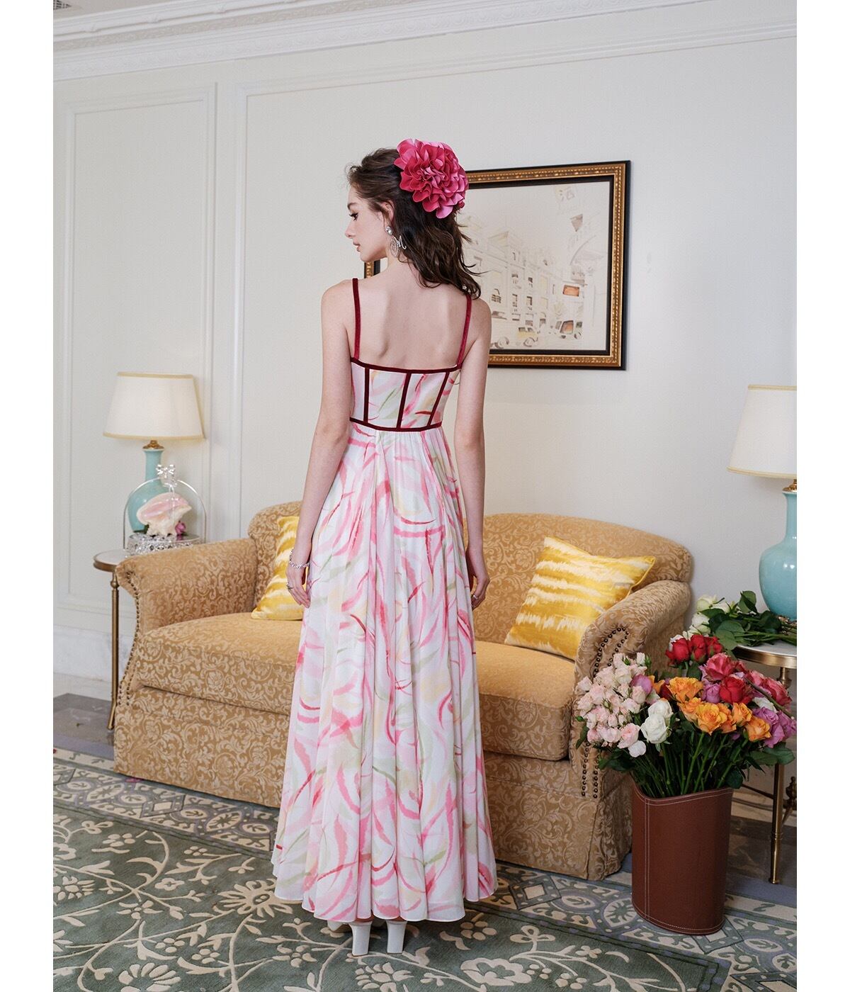 Pinkoz runwya デザイナーセレブスタイリッシュマキシドレス赤花柄 v ネック夏職業 Vestidos traf ローブデ mujer ピンク レッド サマー 夏物 Vネック