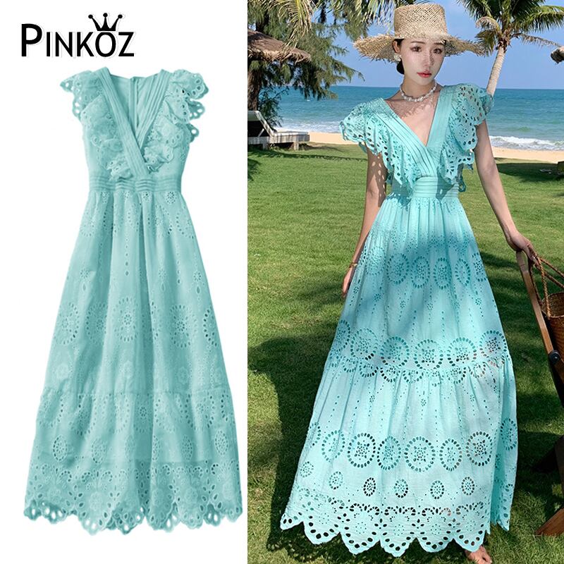 Pinkoz 新しいファッションデザイナースタイリッシュブルーフリルパッチワークレース中空アウトマキシ V ネック職業パーティードレス Vestidos パラ ピンク ラッフル Vネック