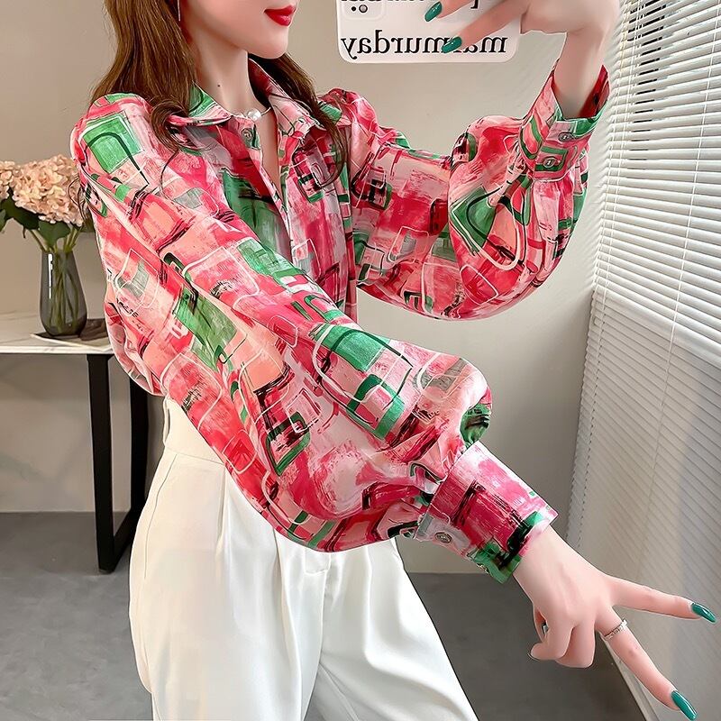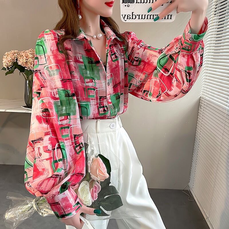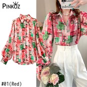 Pinkoz 新しいファッションランタン sleev 春秋ブラウスシングルブレストターンダウン襟シック花 apttern blusa feminina ピンク スプリング 春物 オータム 秋物 花柄 フェミニン
