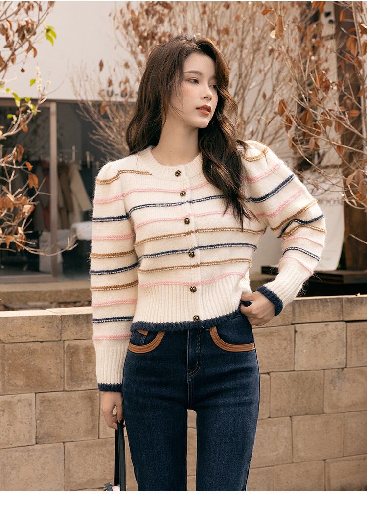Pinkoz 滑走路デザイナーベージュストライプシングルブレスト o ネック長袖ショートぬるぬるニットトップスカーディガンセーター冬布 ロング ピンク ウィンター 冬物 Oネック
