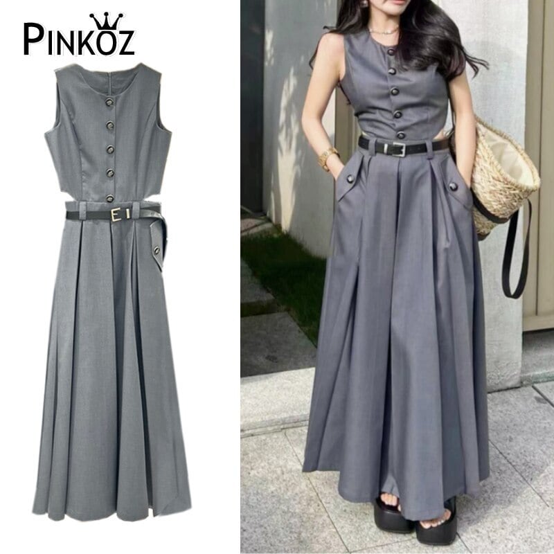 Pinkoz ノースリーブ中空アウトグレー黒ゴシッククールミディドレスベルトハイトストリート traf ドレスvestidos ピンク ブラック ハーネス