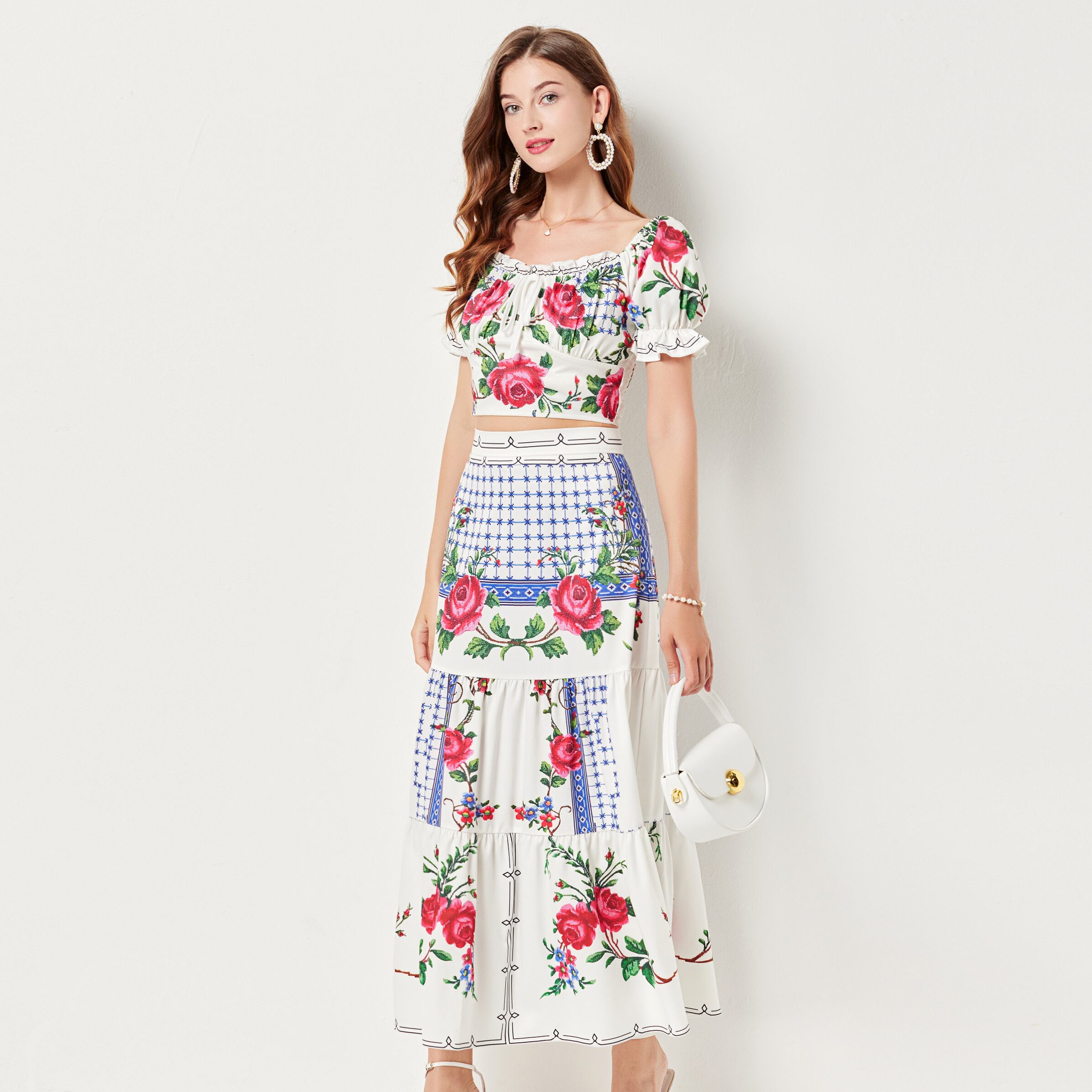 Pinkoz 滑走路新しいファッション 2 枚セット花柄チェック柄プリントスラッシュネックトップスマキシロングスカートファッション Vestidos ピンク