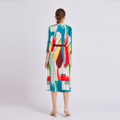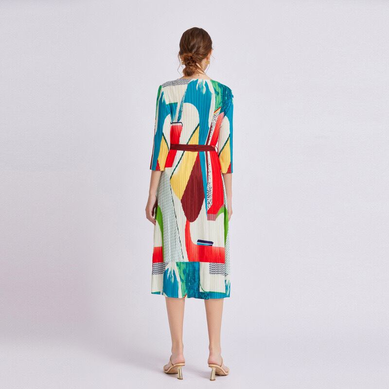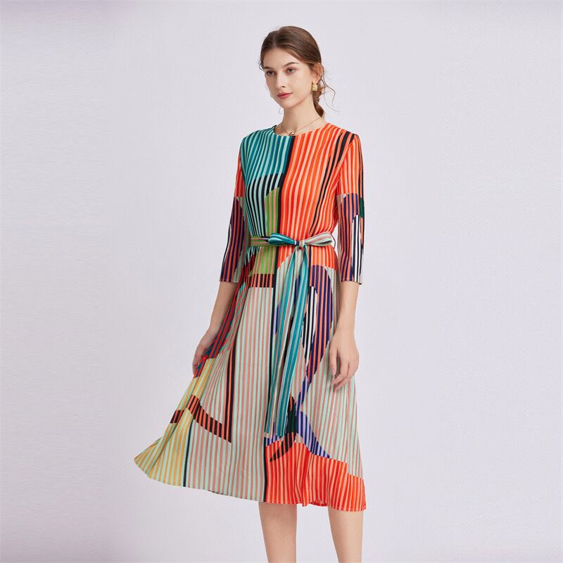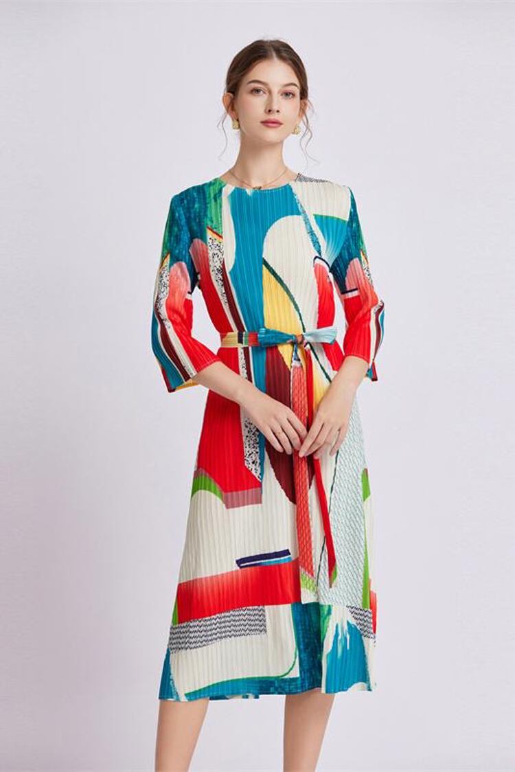 Pinkoz runwya デザイナープリーツ o ネックルーズミディドレス青赤カラフルパターンプリントレースアップローブデムジェ Vestidos traf ピンク レッド ブルー Oネック