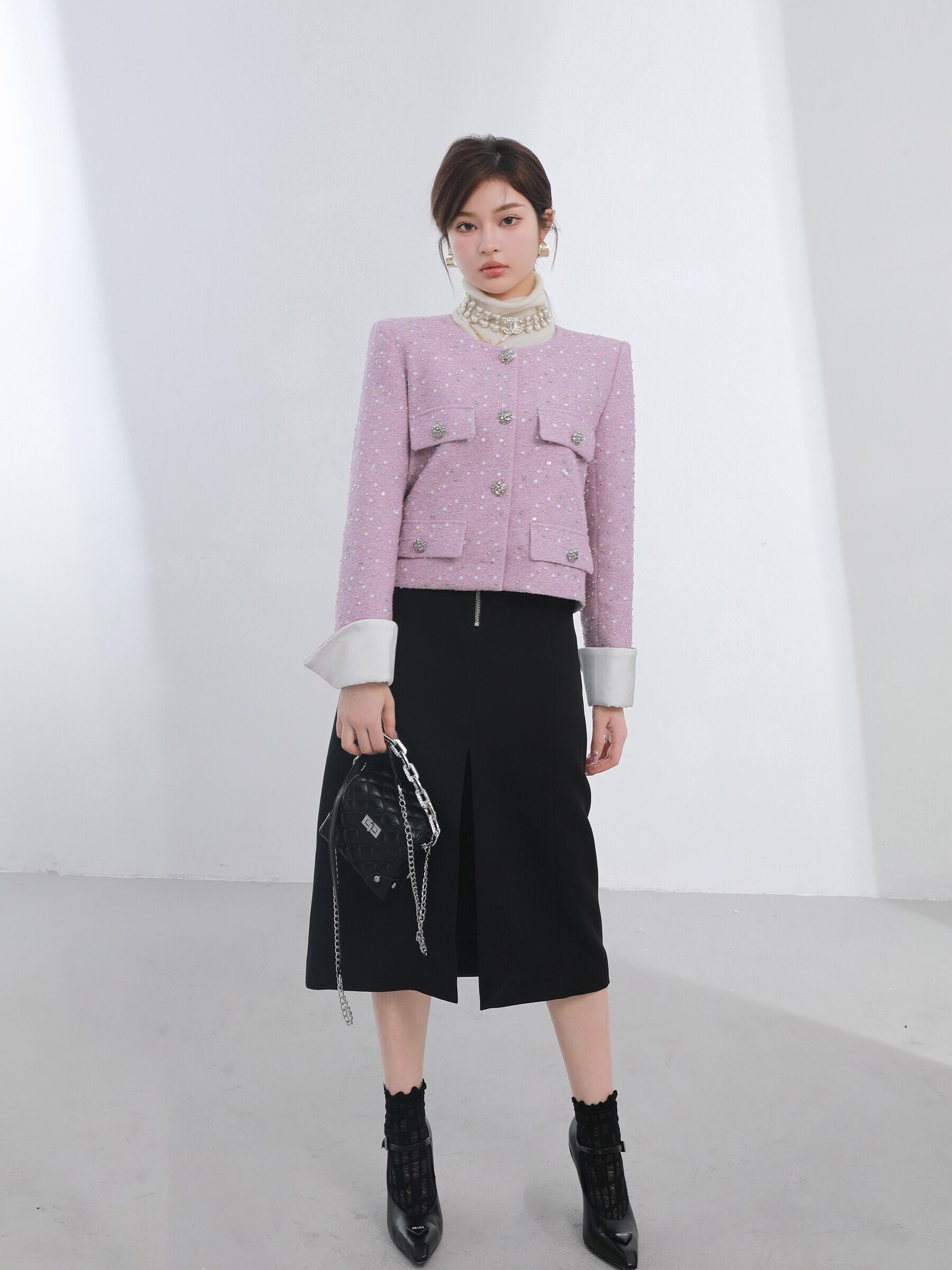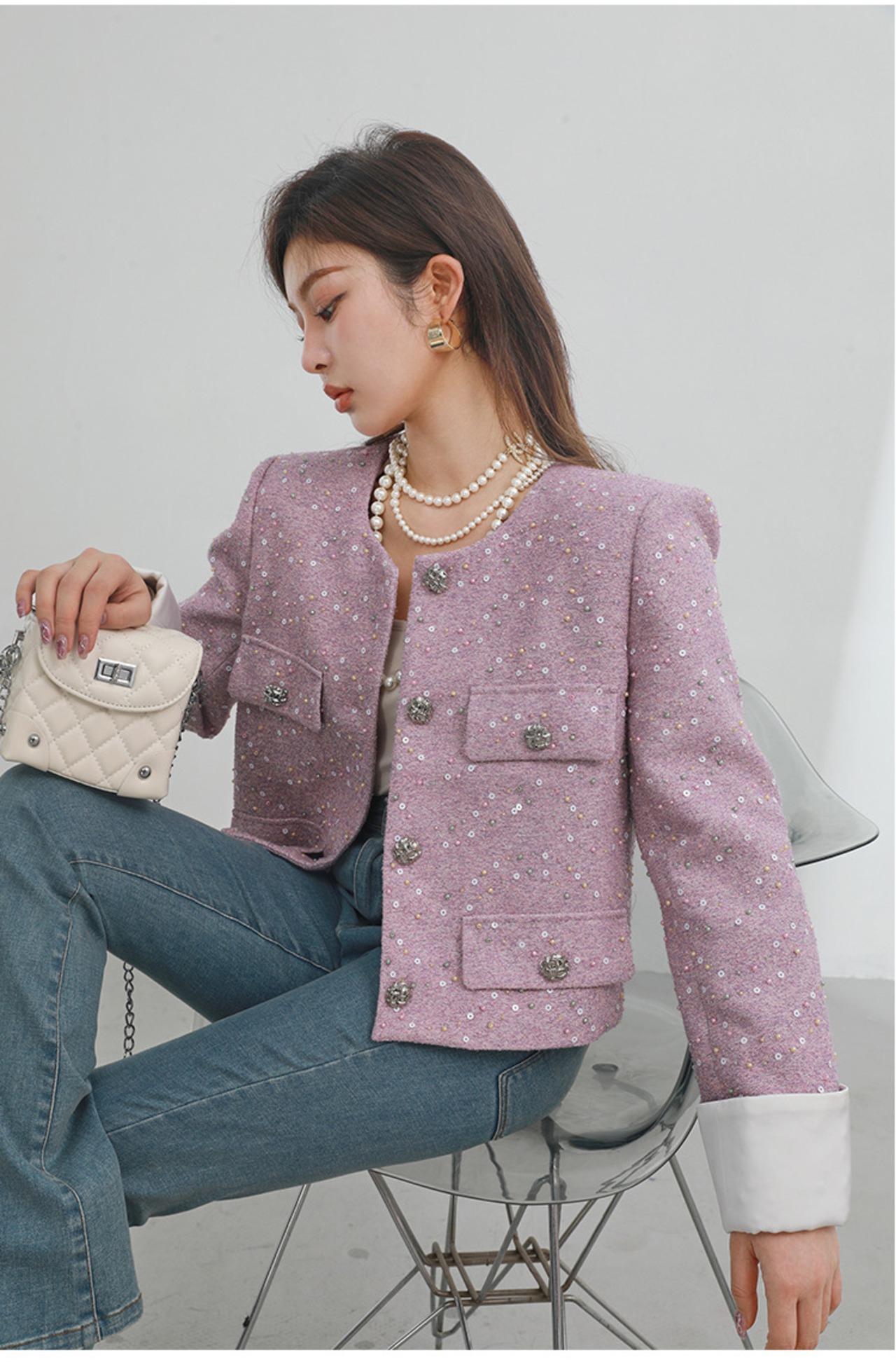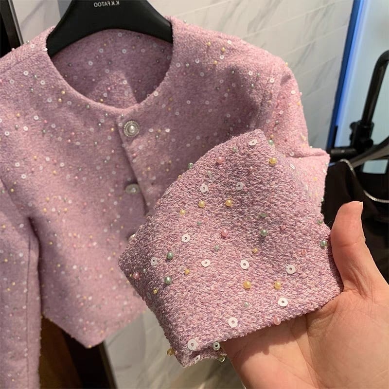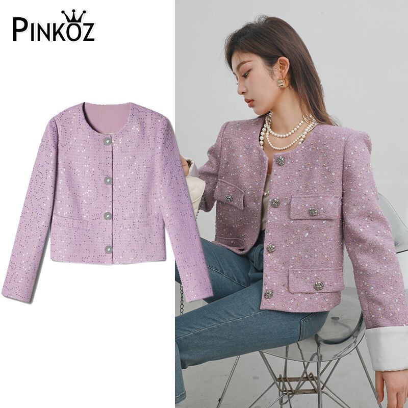Pinkoz 滑走路デザイナーバイオレットシングルブレスト高級ジャケットツイードショートオーバーコート新しいボタンパーティーナイト服冬トップス ピンク ウィンター 冬物