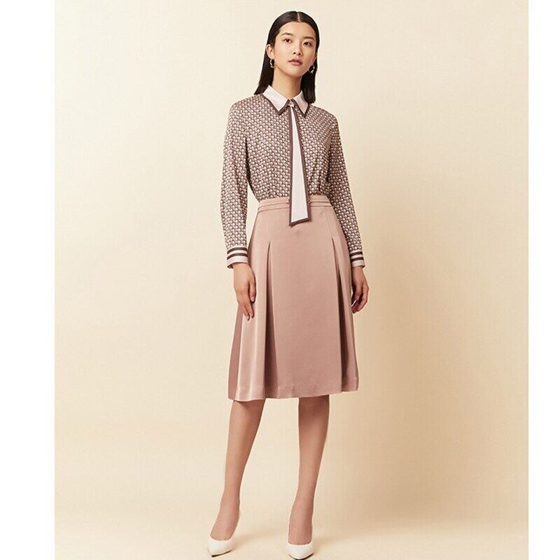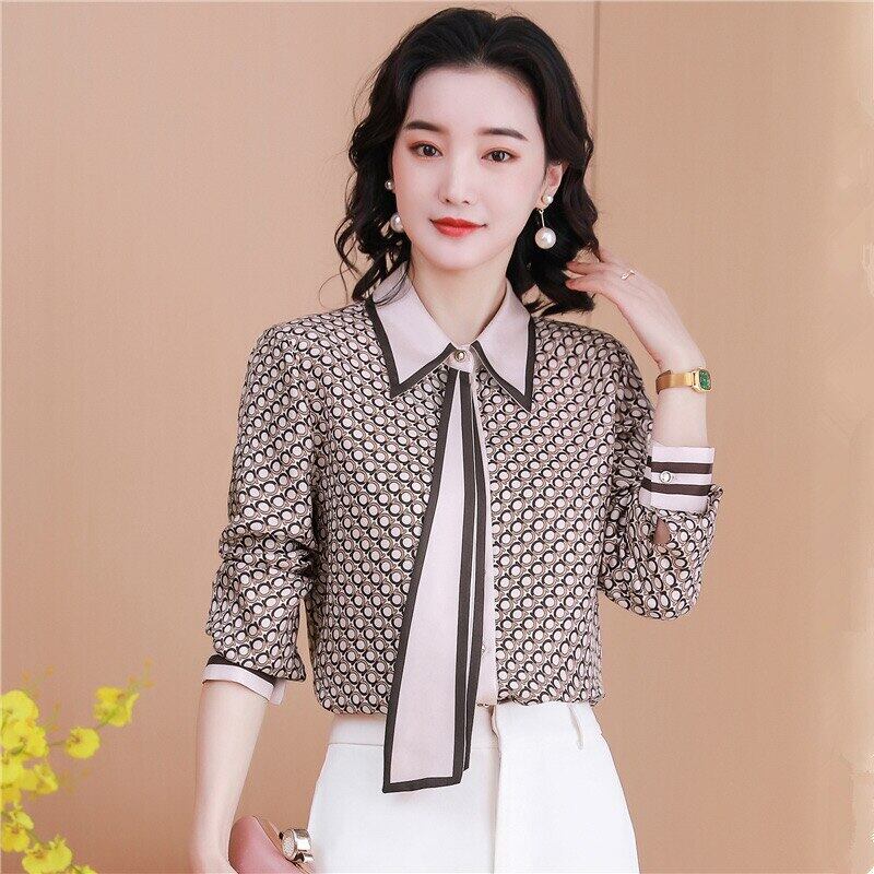 Pinkoz デザイナーブラウンチェック柄プリントシックエレガント弓ターンダウン襟サテンブラウスシャツトップスビッグサイズ 3XL ピンク リボン