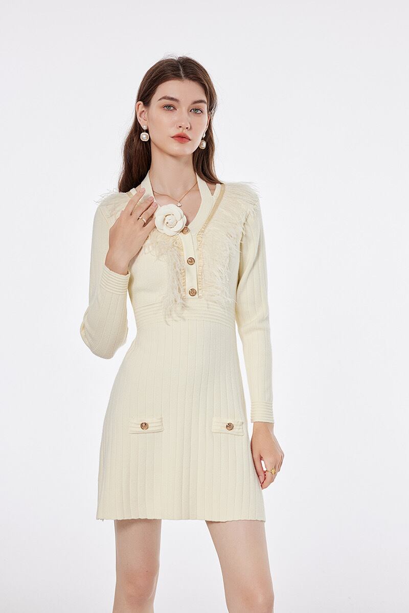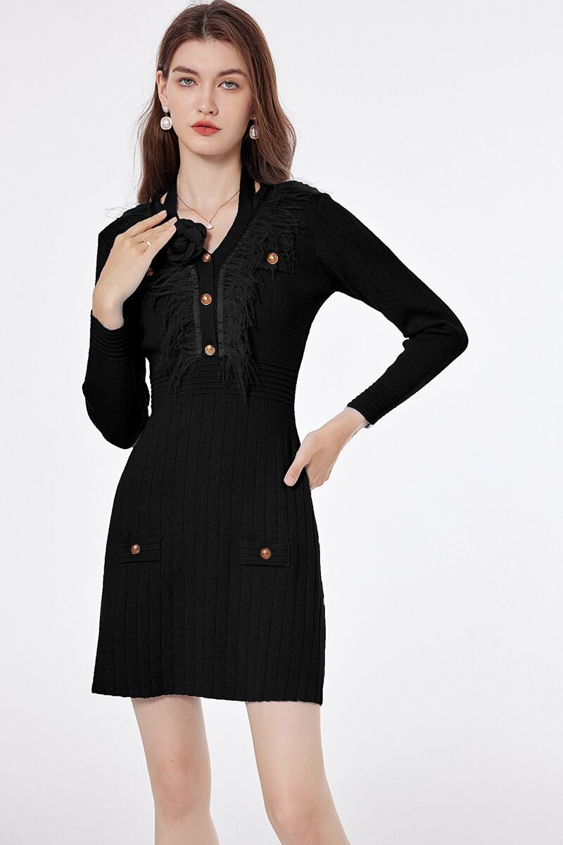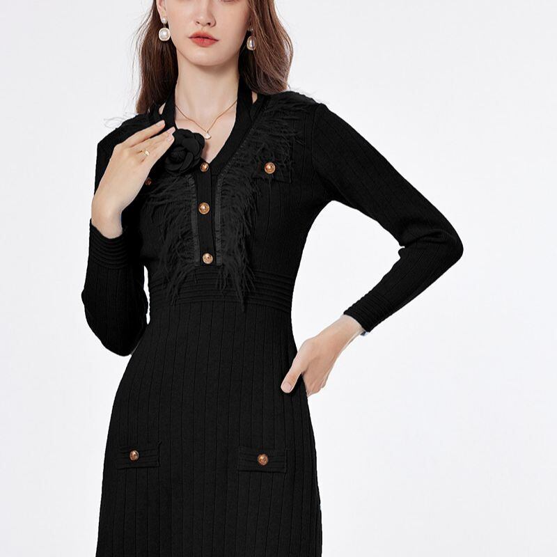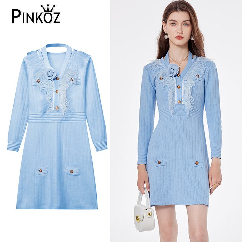 Pinkoz 秋ミニニットドレス v ネックボタン弾性ぬるぬるファム服ファッションエレガントドレス甘いぼかし Vestidos ピンク エラスティック 伸縮 大人ガーリー スウィート キュート カジュアル オータム 秋物 Vネック フェミニン