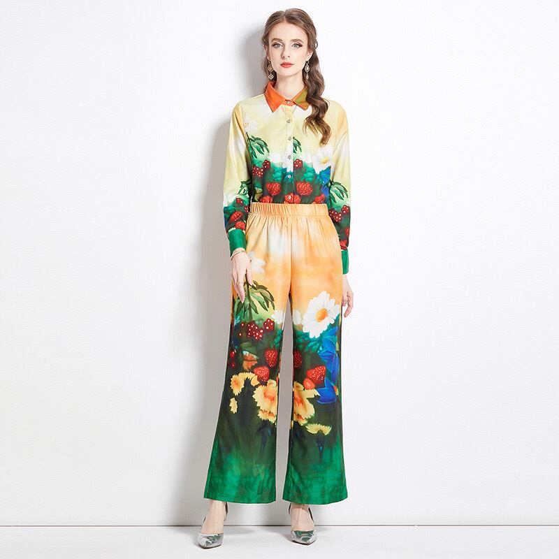 Pinkoz 滑走路デザイナー自由奔放生きる花柄 2 枚セットルーズターンダウンカラーシャツロングワイドレッグパンツ衣装スーツ za ピンク ワイドパンツ