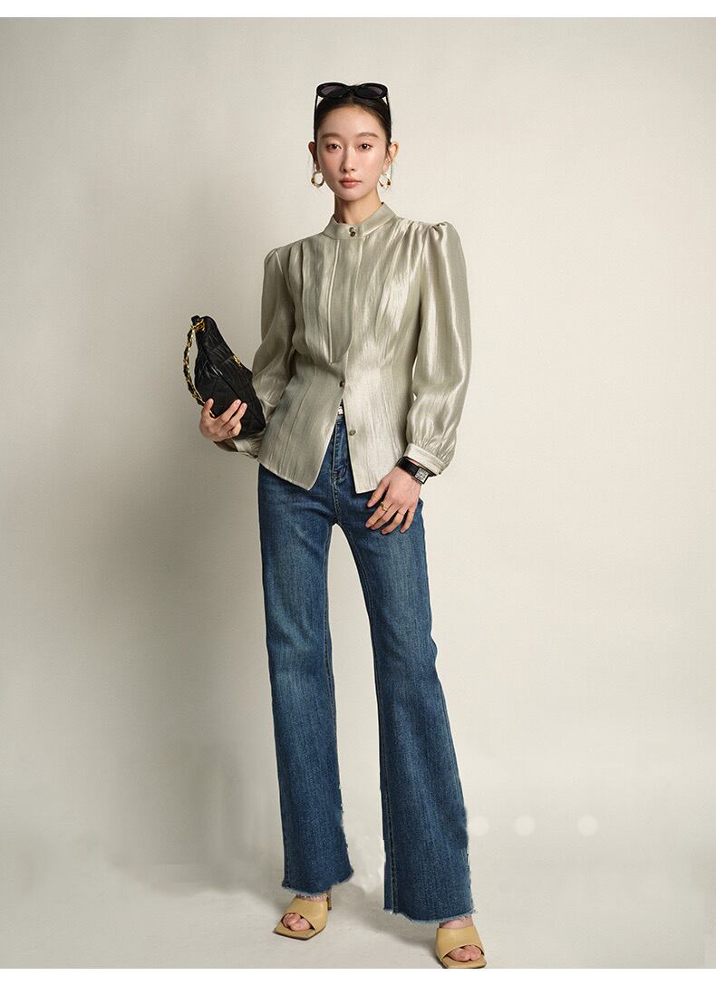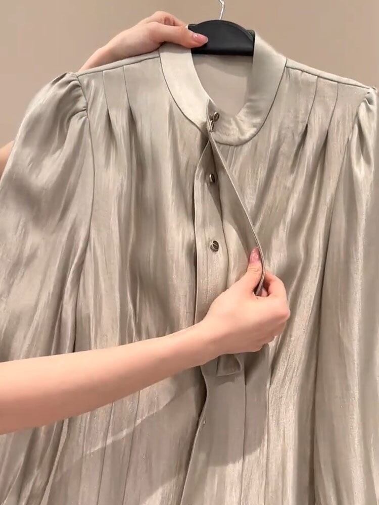 Pinkoz デザイナースタンドカラー長袖ハイウエストベージュボタンぬるぬるシャツ A ラインシャツブラウスエレガント作業服トップス za ハイウェスト ロング ピンク Aライン