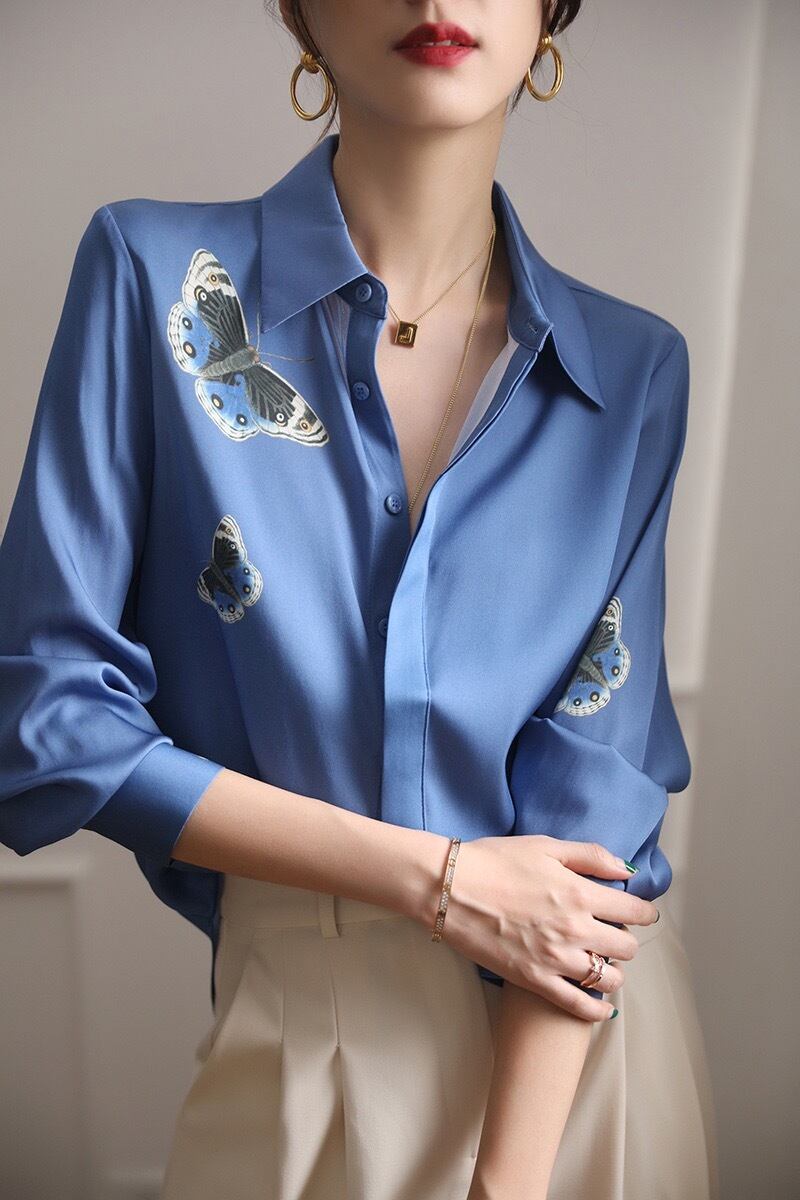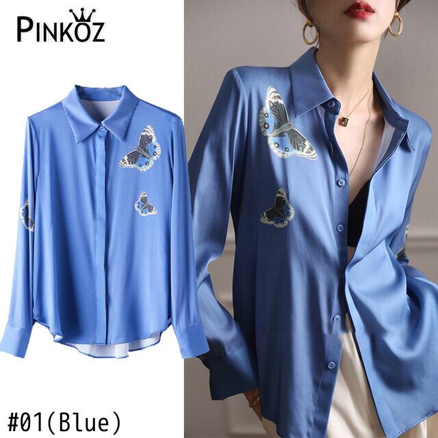 Pinkoz ランウェイデザイナー青い蝶刺繍ルーズシャツエレガント長袖ターンダウンカラーシャツブラウス roupas feminina ロング ピンク ブルー フェミニン