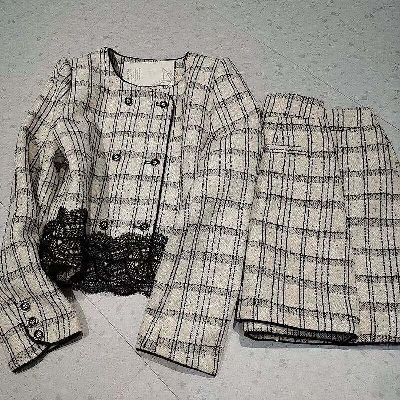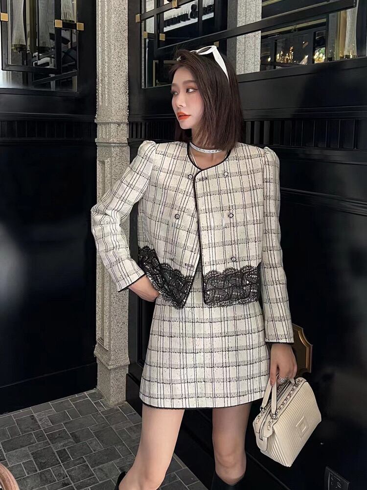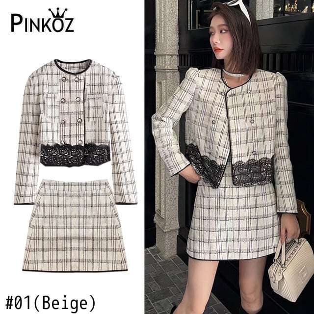 Pinkoz ランウェイデザイナースタイリッシュチェック柄ダブルブレスト O ネックショートジャケットパッチワークレース冬ミニスカート 2 枚セットヴィンテージ ピンク ウィンター 冬物 Oネック ビンテージ