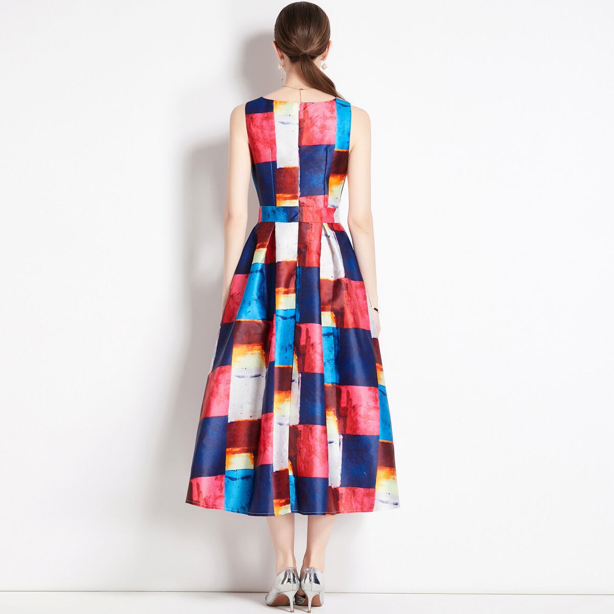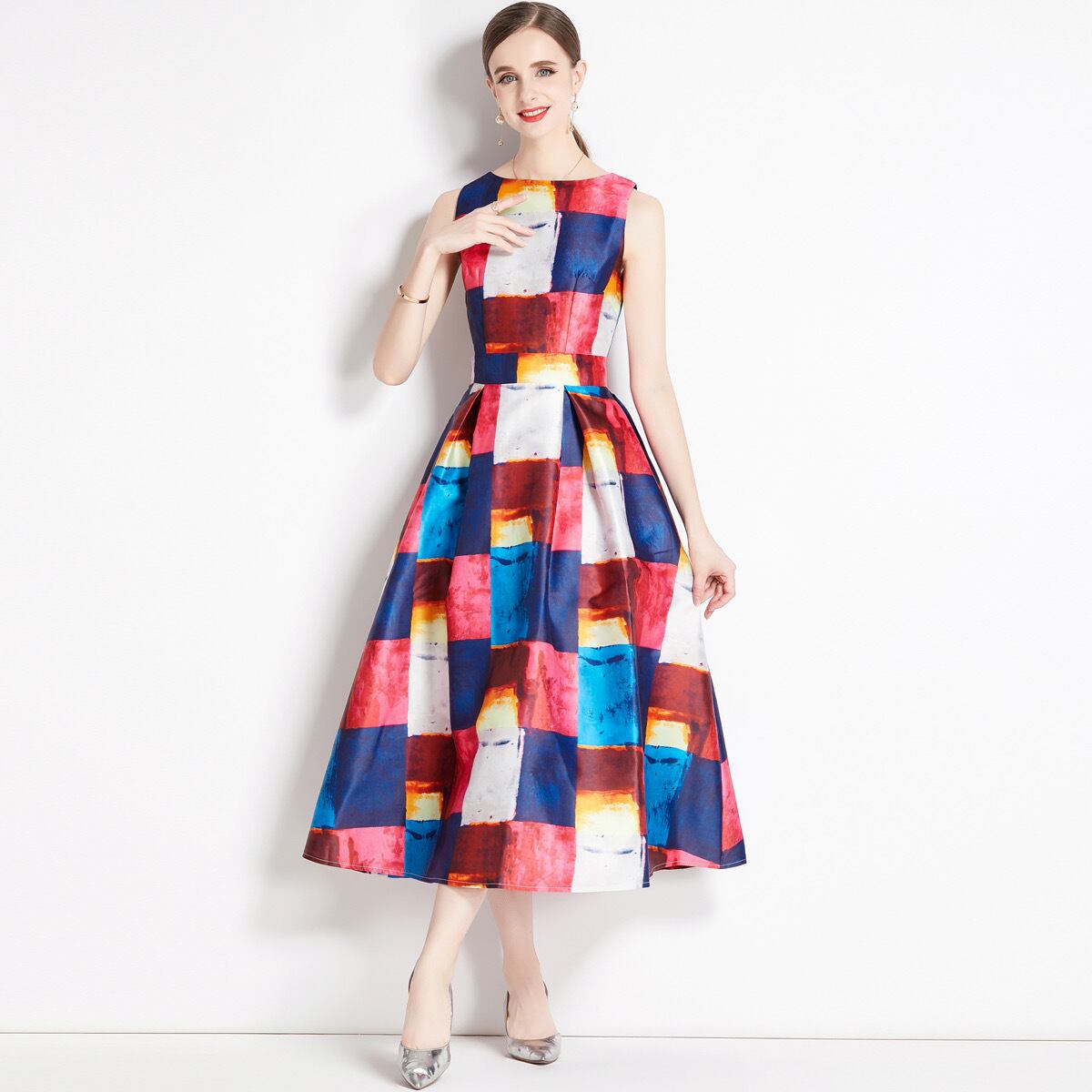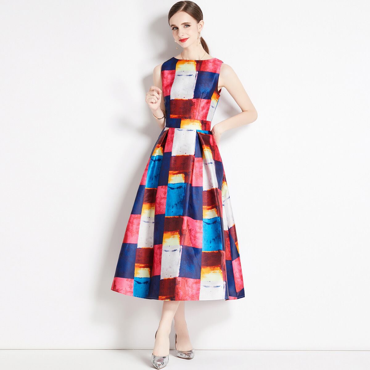 Pinkoz 滑走路デザイナーチェック柄 o ネックタンクノースリーブミディドレス新ファッション春夏夜パーティー Vestidos ヴィンテージローブ traf ピンク スプリング 春物 サマー 夏物 Oネック ビンテージ