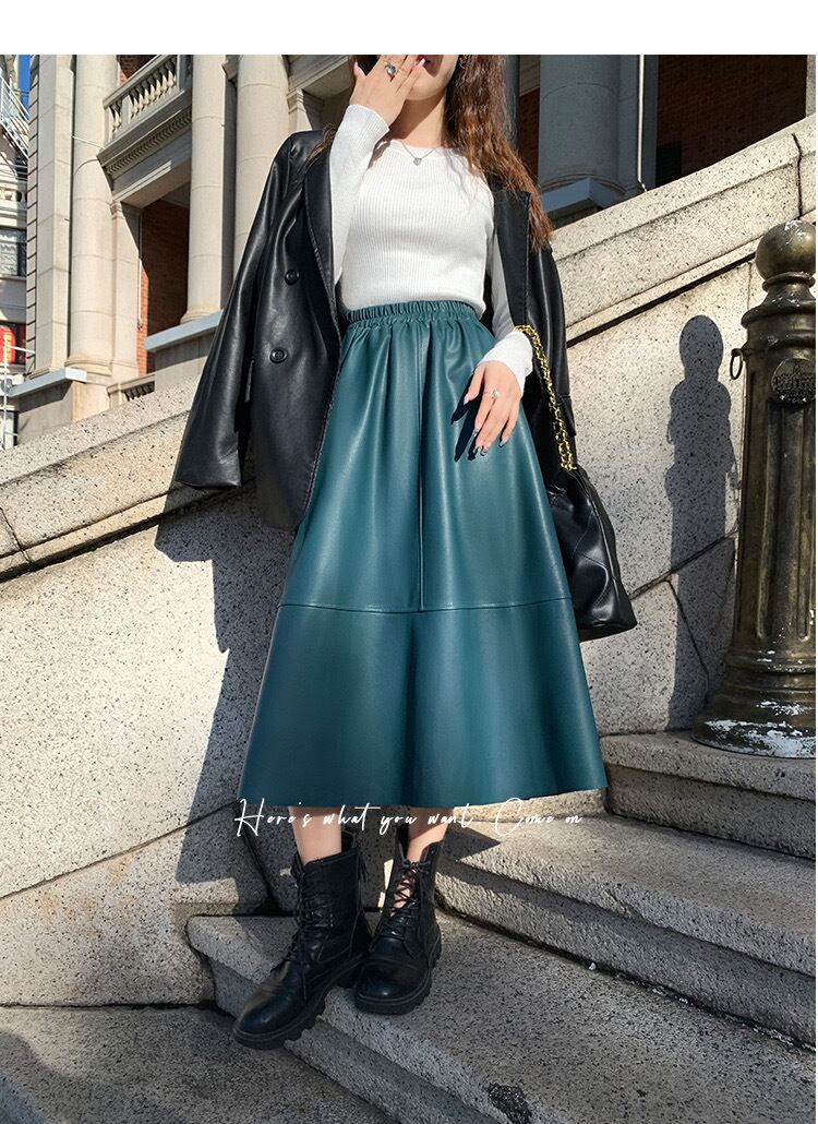 Pinkoz 滑走路ファッションブルー PU レザーミディスカートカジュアルエレガント OL パッチワーク秋冬ボトムススカートヴィンテージ ピンク オータム 秋物 ウィンター 冬物 ビンテージ