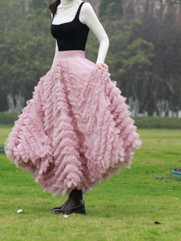 Pinkoz 高級ヴィンテージピンクシャーリングパーティーナイトマキシスカートファムハイウエストカジュアルエレガントフレンチシックスカートフェスティバル ハイウェスト フェミニン ビンテージ