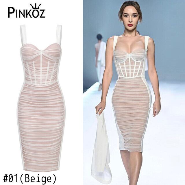 Pinkoz ぬるぬるセクシー膝丈ドレス白パッチワークメッシュスパゲッティストラップパーティーナイトクラブドレス y2k zevety 夏vestidos ピンク ホワイト サマー 夏物