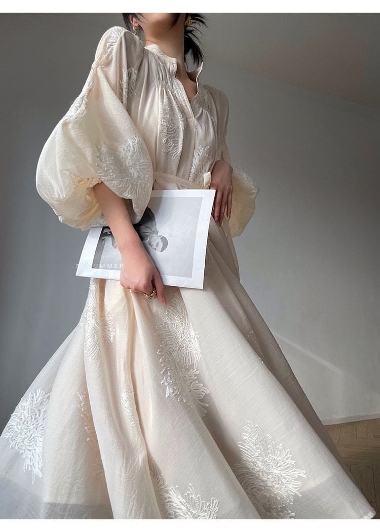 Pinkoz ルースホワイトミディドレス高級刺繍ランタンスリーブ O ネック春秋ドレスフレンチシック Vestidos ヴィンテージ za ピンク レッド スプリング 春物 オータム 秋物 Oネック ビンテージ
