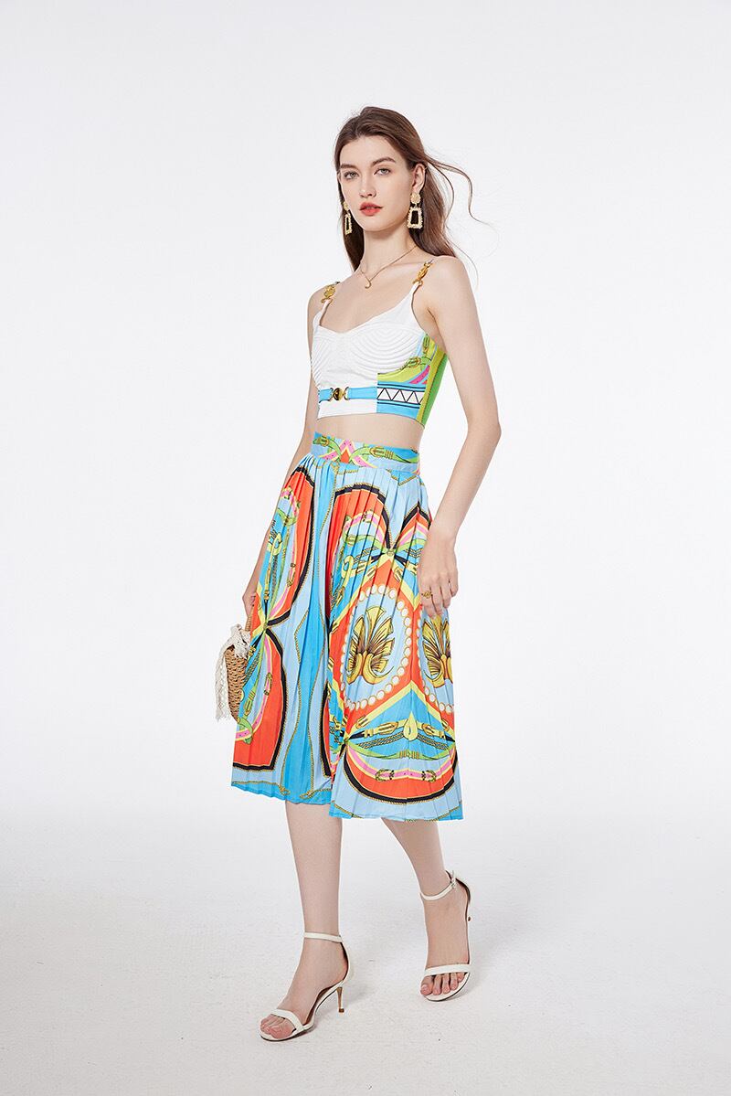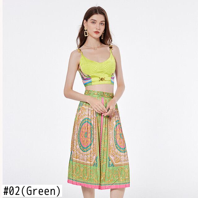 Pinkoz デザイナースタイリッシュ花柄バロックヴィンテージプリント 2 枚セットショートキャミソールトップスミディプリーツスカート ピンク ビンテージ