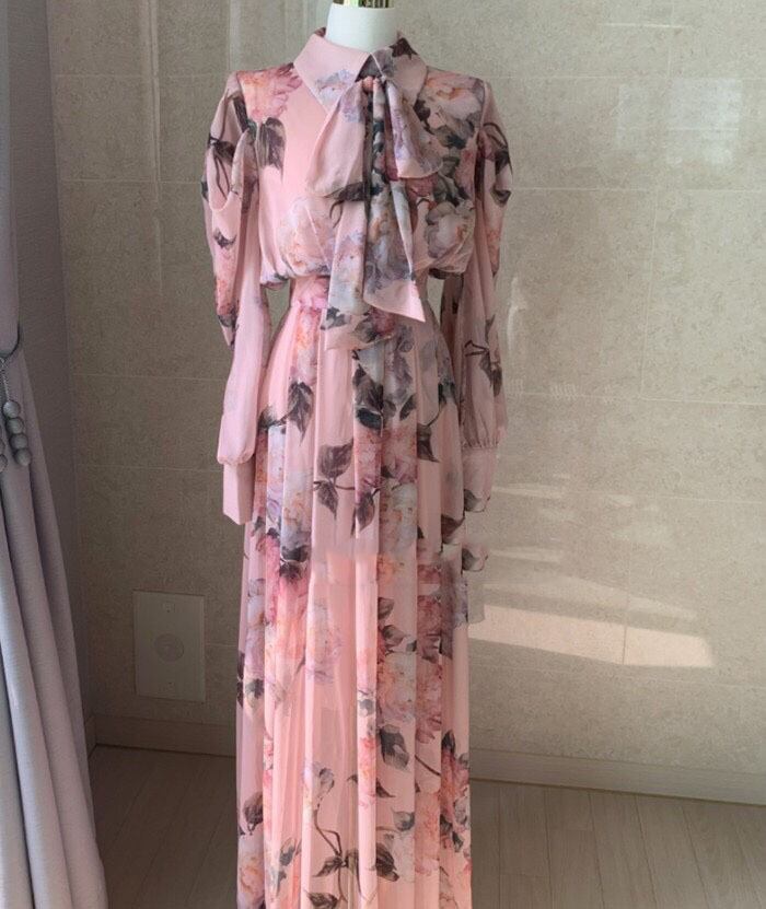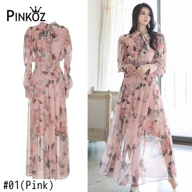 Pinkoz 夏春花柄リボン襟高級マキシドレスリボンファッションボヘミアンローブデムジェ traf ピンク スプリング 春物 サマー 夏物