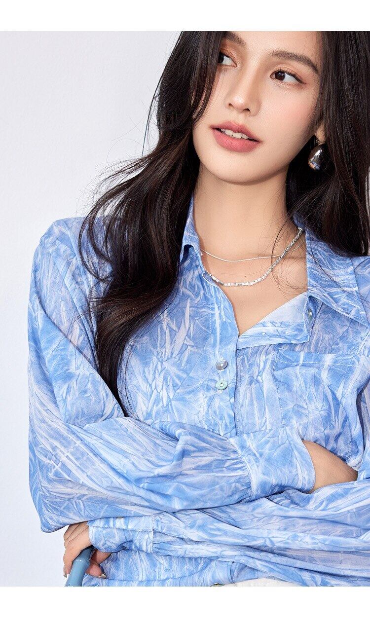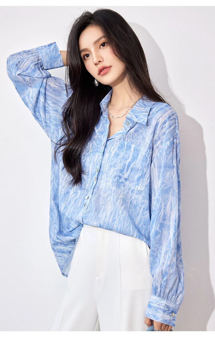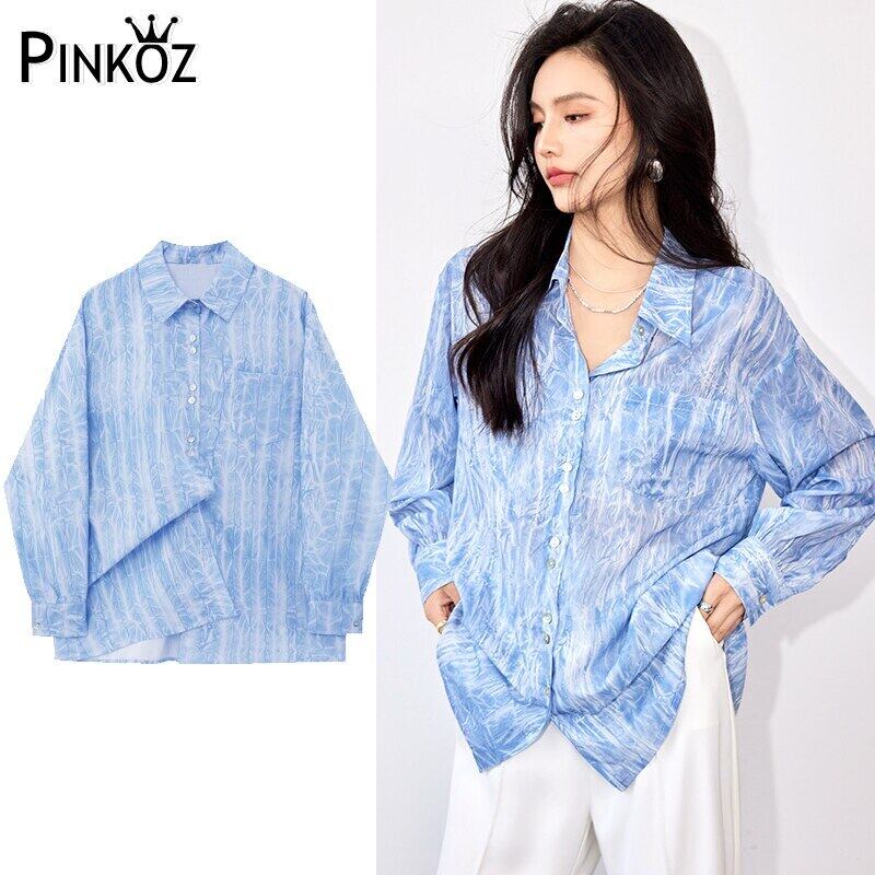 Pinkoz ファッションルーズブルーシャツポケットカジュアルストリートシフォン春夏トップスデ プリントビッグサイズブラウスヴィンテージ ピンク スプリング 春物 サマー 夏物 ビンテージ