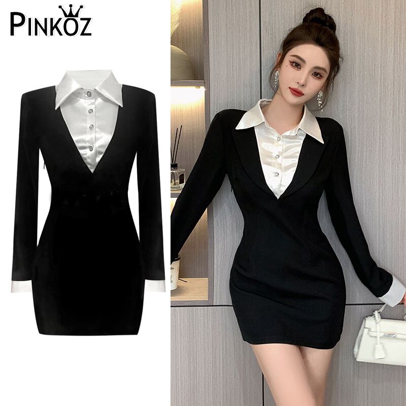 Pinkoz ファッションミニ黒パッチワークドレスシングルブレストボタンターンダウン襟ゴシッククラブナイトファムドレスvestidos ピンク ブラック フェミニン