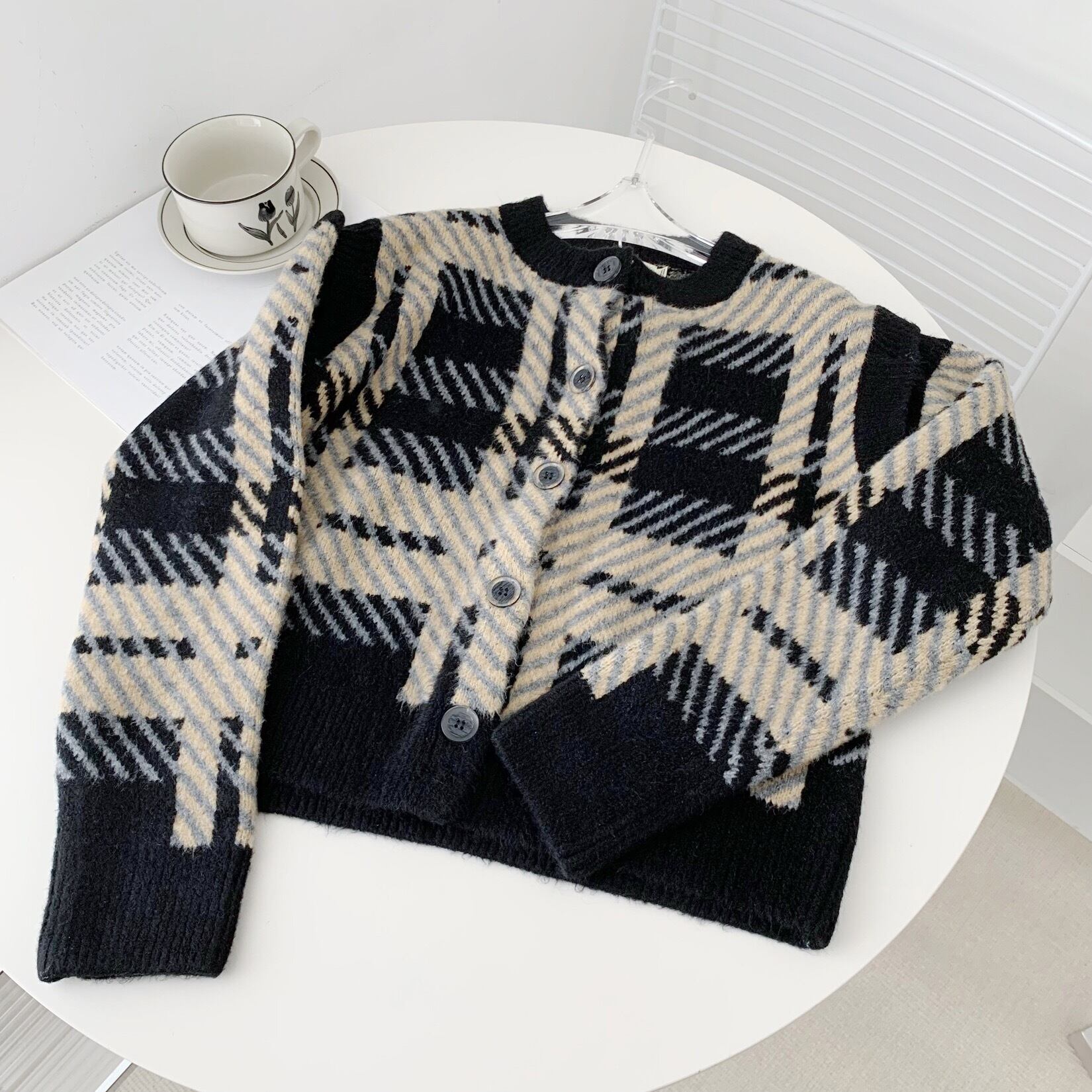 Pinkoz 滑走路デザイナースタイリッシュチェック柄中空アウト新しいファッションセーター秋冬シングルブレストニットシックカジュアルセーター za ピンク オータム 秋物 ウィンター 冬物
