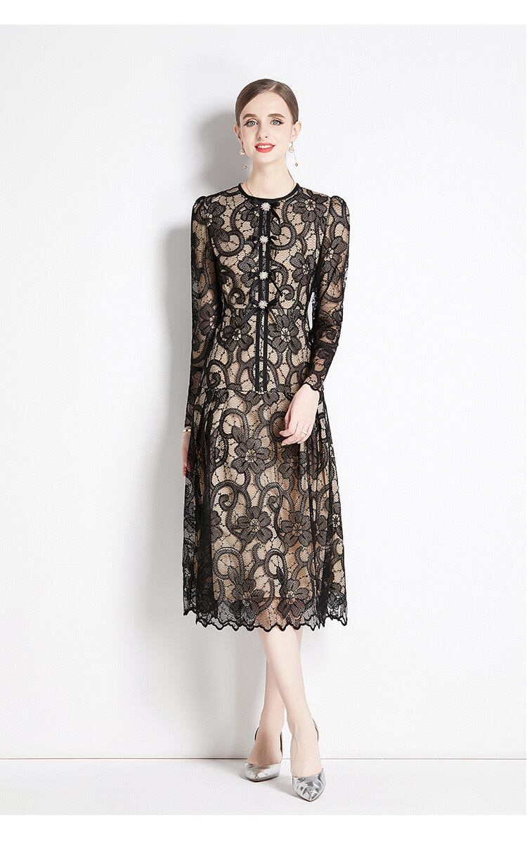 Pinkoz デザイナー o ネック長袖秋冬レースエレガントドレス黒中空アウト作業服パーティードレスシック新 ロング ピンク ブラック オータム 秋物 ウィンター 冬物 Oネック