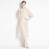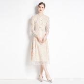 Pinkoz デザイナースタイリッシュベージュレース中空アウトミディドレスパッチワーク弓エレガント o ネックシックローブデ mujer パーティー Vestidos ピンク リボン Oネック