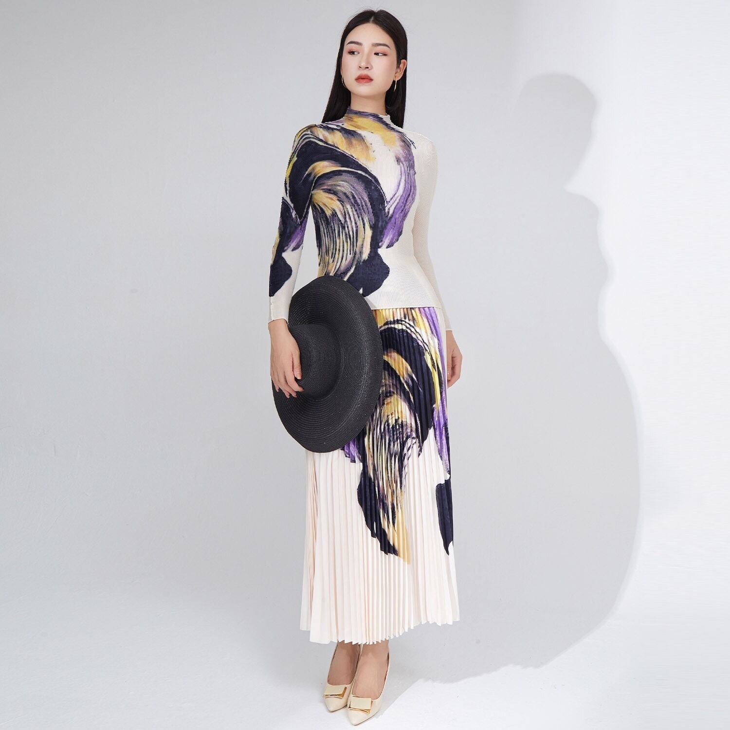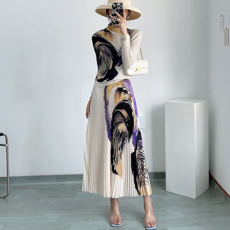 Pinkoz 2 枚セットぬるぬるプリーツトップスミディスカートプリントヴィンテージ春秋エレガントファッション衣類スーツ ピンク スプリング 春物 オータム 秋物 ビンテージ