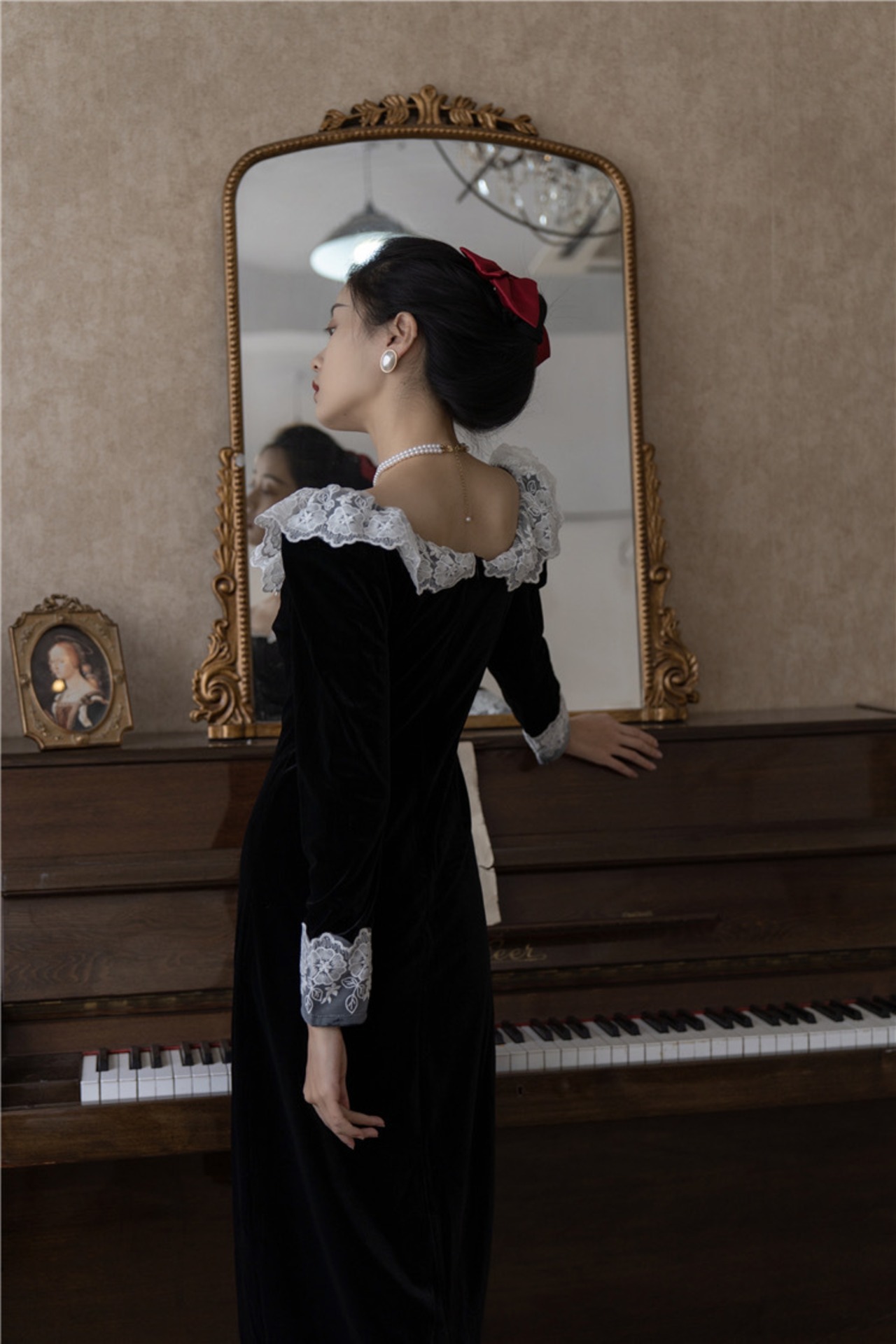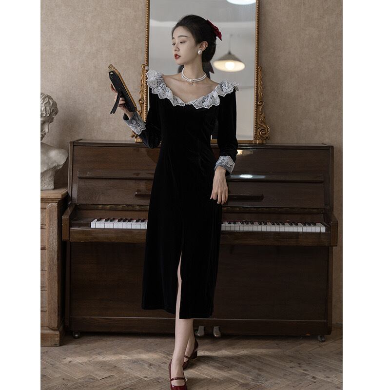 Pinkoz ヴィンテージ Vestidos ベルベット黒パッチワークレース V ネックミディロングドレスカジュアルエレガントフレンチシック秋冬 za ピンク ブラック オータム 秋物 ウィンター 冬物 Vネック ビンテージ