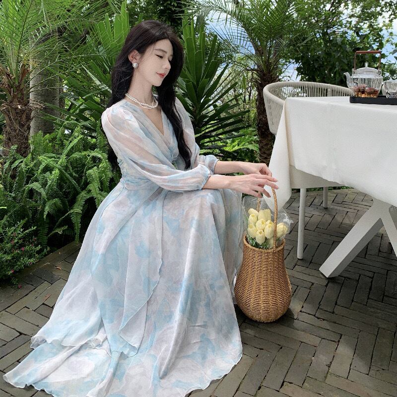 Pinkoz ライトブルー花柄プリント v ネック非対称ミディシフォンドレス長袖春夏カジュアル Vestidos ロング ピンク スプリング 春物 サマー 夏物 Vネック