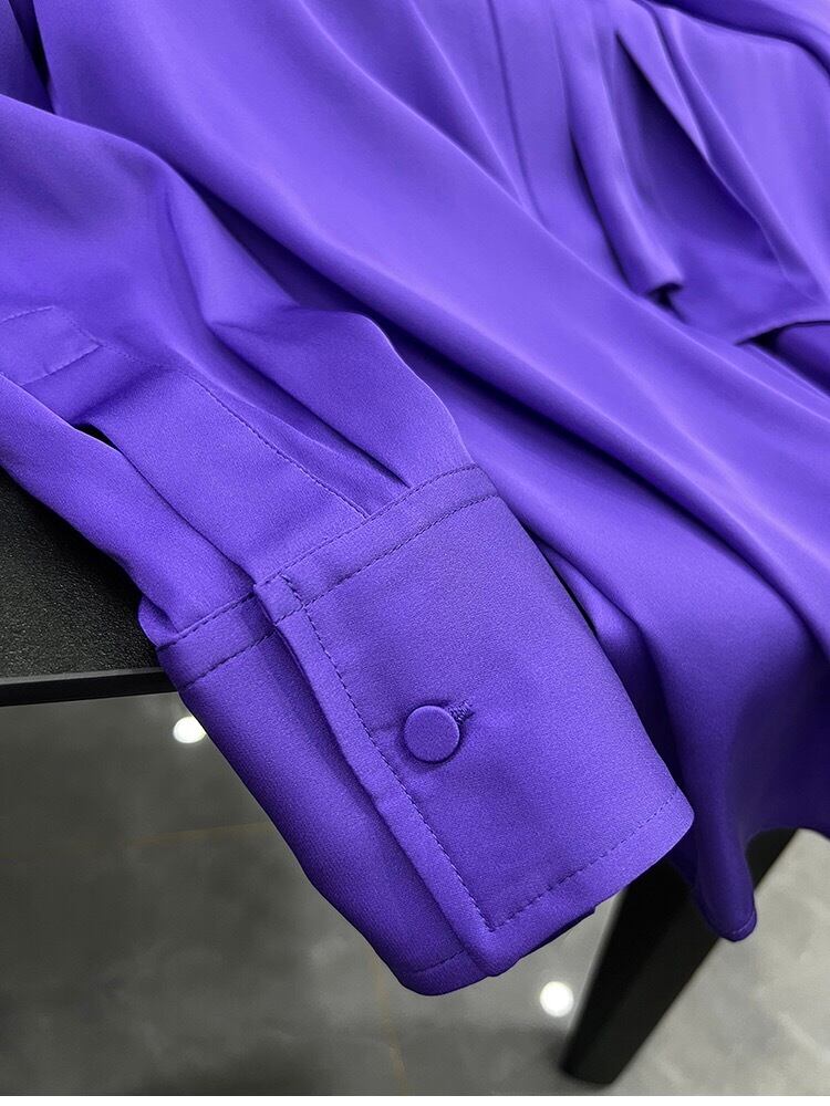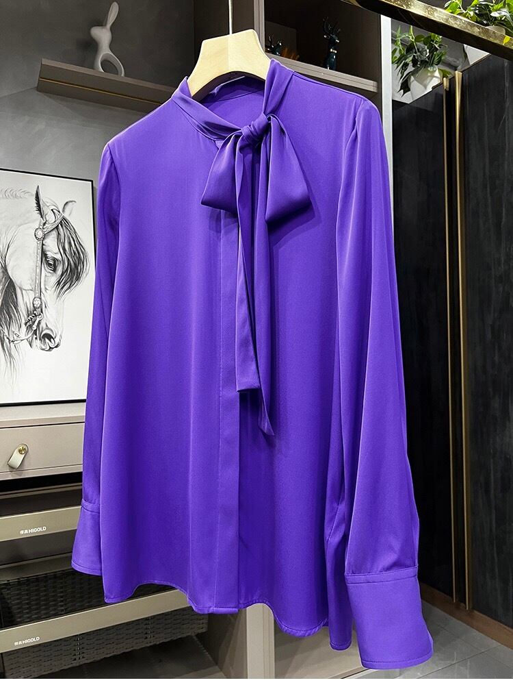 Pinkoz セレブスタイリッシュ紫色リボン襟シングルブレストシャツ長袖エレガントオフィスレディ王子服ブラウス za ロング ピンク パープル 会社 学校 通勤や通学にも