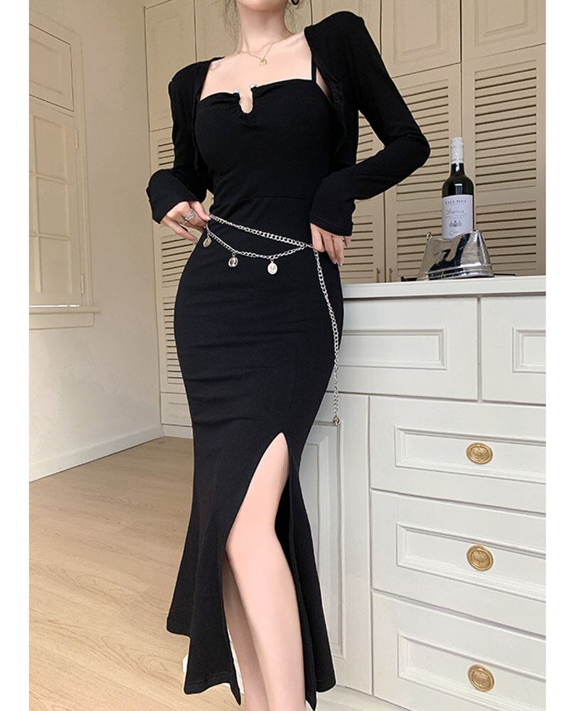 Pinkoz 黒ゴシックツーピースドレス秋ぬるぬる bdycon スパゲッティストラップミディドレス + カーディガンセットローブ + ベルト ピンク ブラック オータム 秋物 ハーネス