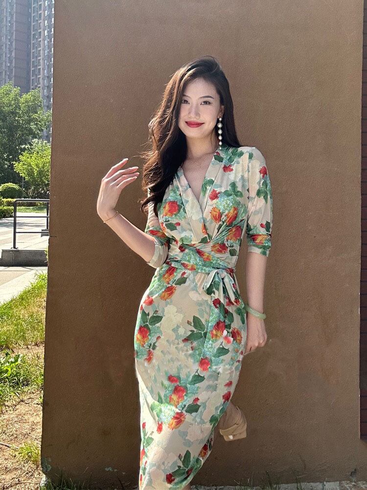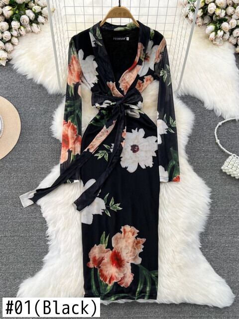 Pinkoz elagnt フラワープリント v ネックメッシュ弾性オフィスレディミディドレス花柄春夏シックローブデ mujer ピンク エラスティック 伸縮 スプリング 春物 サマー 夏物 Vネック フラワーデザイン 会社 学校 通勤や通学にも