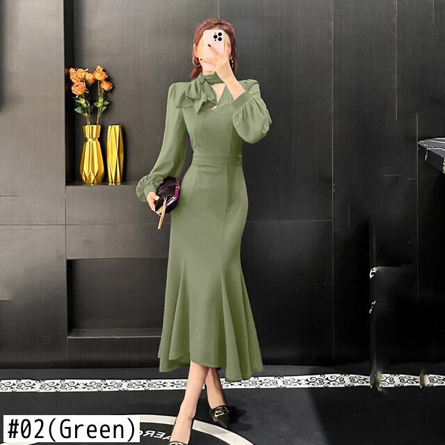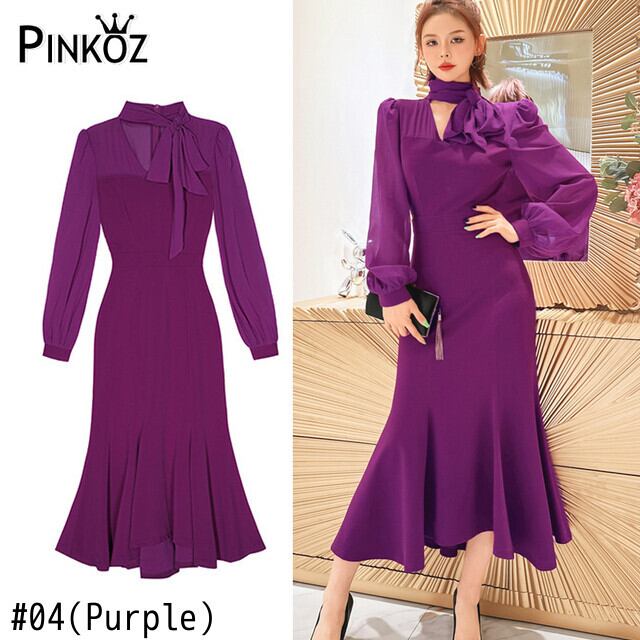 Pinkoz エレガントマーメイドミディドレス弓襟パッチワークメッシュ秋冬長袖ドレスパープルナイト OL vestidos traf ロング ピンク リボン ウィンター 冬物