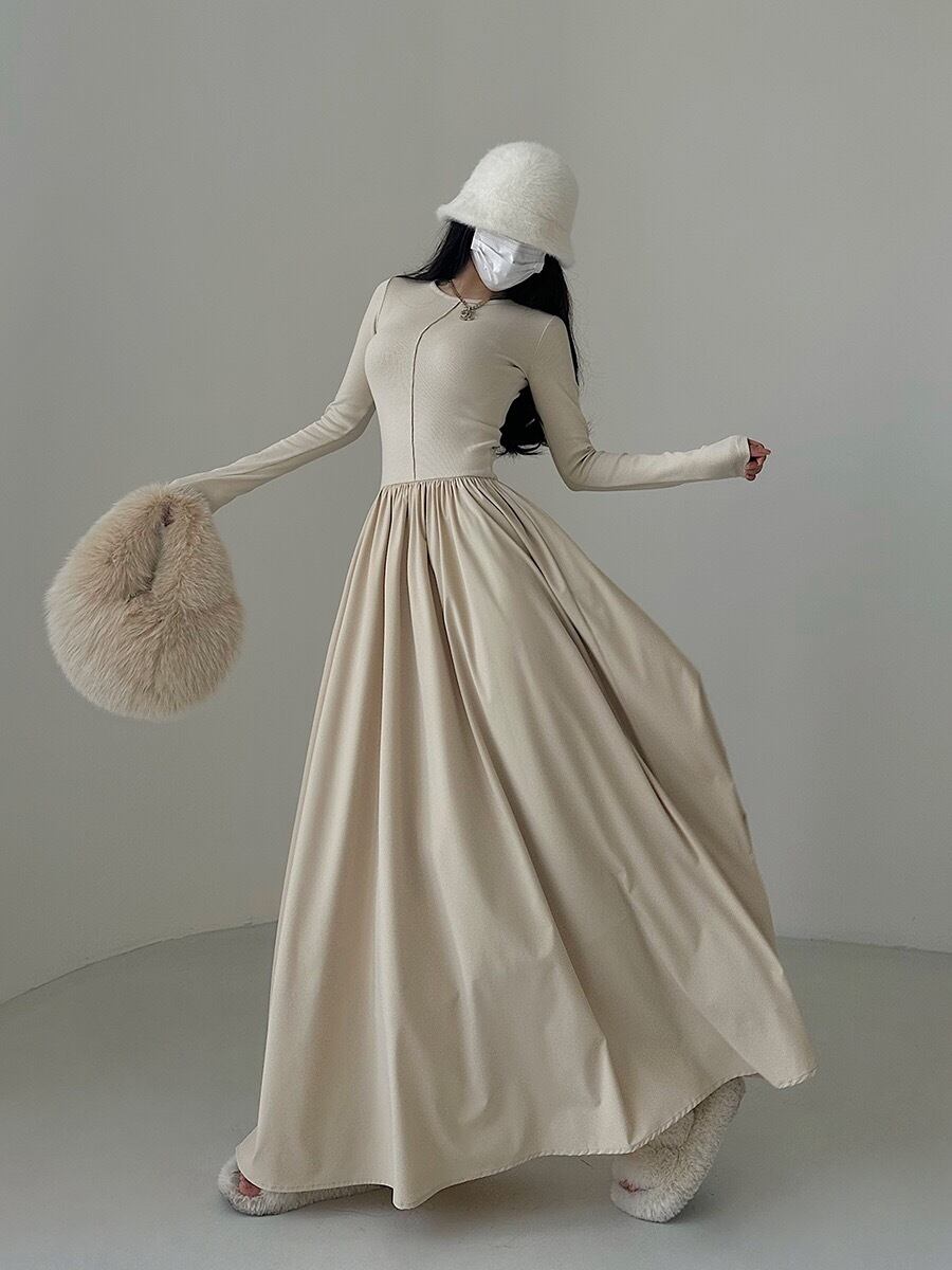 Pinkoz o ネックパッチベージュ弾性マキシドレスカジュアルストリートウェア長袖ファッションナイト秋冬 vetidos 新しい ロング ピンク エラスティック 伸縮 オータム 秋物 ウィンター 冬物 Oネック
