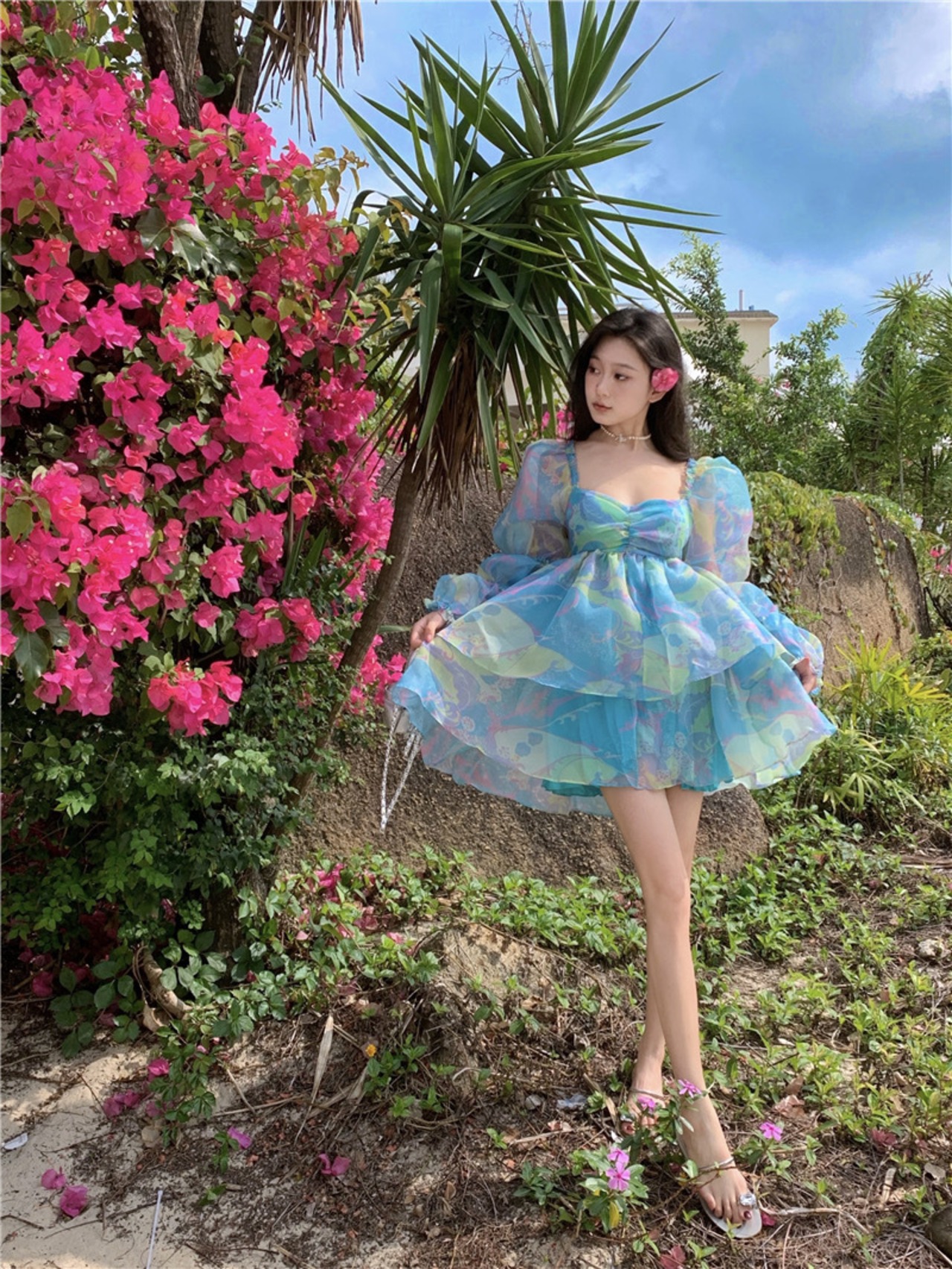 Pinkoz sprin 夏新スクエアカラー長袖ブルーグリーン絵画パターンプリント若い甘いバックレスドレス traf ロング ピンク 大人ガーリー スウィート キュート カジュアル サマー 夏物 スクウェア