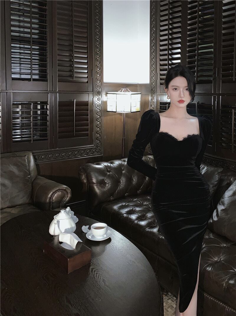 Pinkoz 秋冬黒ミニ不規則ドレスパッチワークスクエアカラーヴィンテージベルベット背中開いたパーティーナイトvestidos traf ピンク ブラック オータム 秋物 ウィンター 冬物 スクウェア ビンテージ