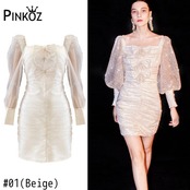 Pinkoz セレブスタイリッシュ春スクエアカラー長袖グリッターメッシュミニぬるぬるドレスパーティー誕生日ファッション traf ロング ピンク スプリング 春物 スクウェア