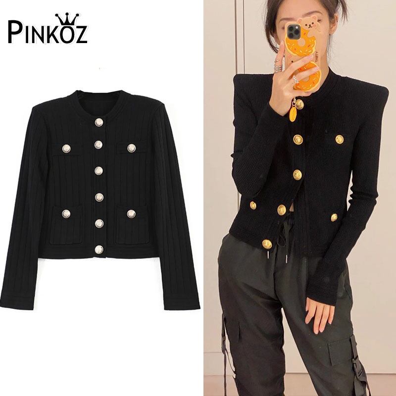 Pinkoz 滑走路デザイナーシングルブレストポケットボタン黒カーディガンニットぬるぬるセータージャケットトップス traf ファッション衣類 ピンク ブラック