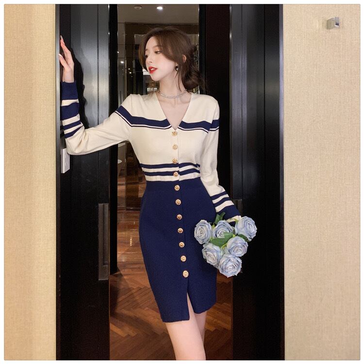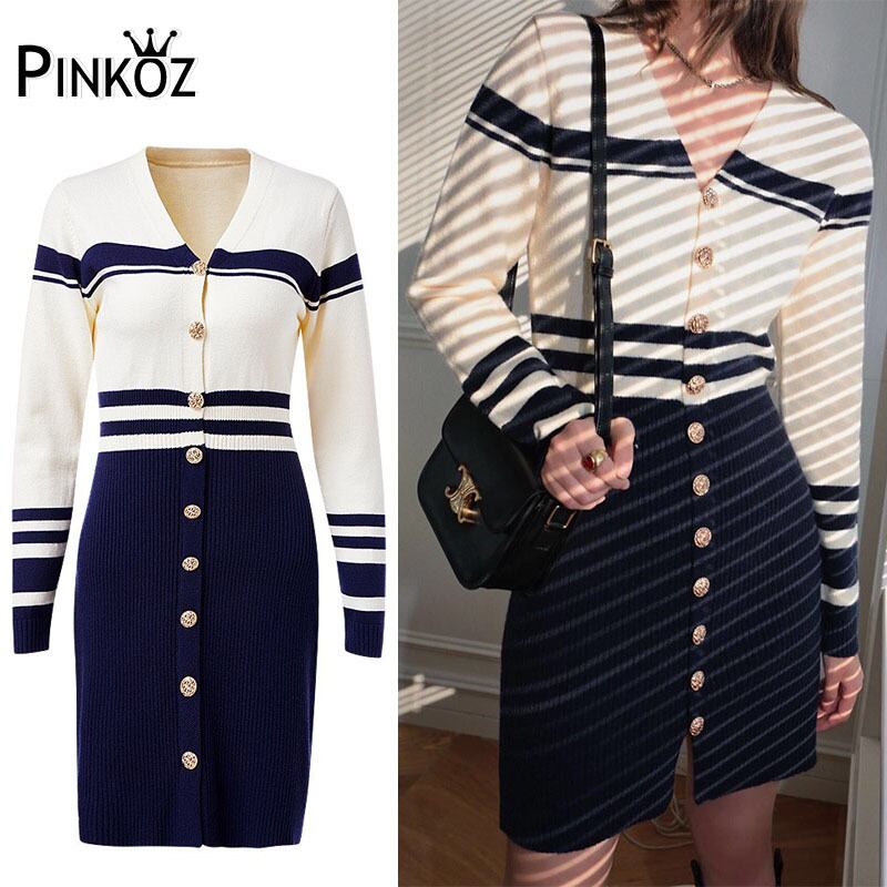 Pinkoz エレガントネイビーブルーストライプミニぬるぬるニットドレス v ネックシングルブレストボタンエレガント Vestidos za ピンク Vネック