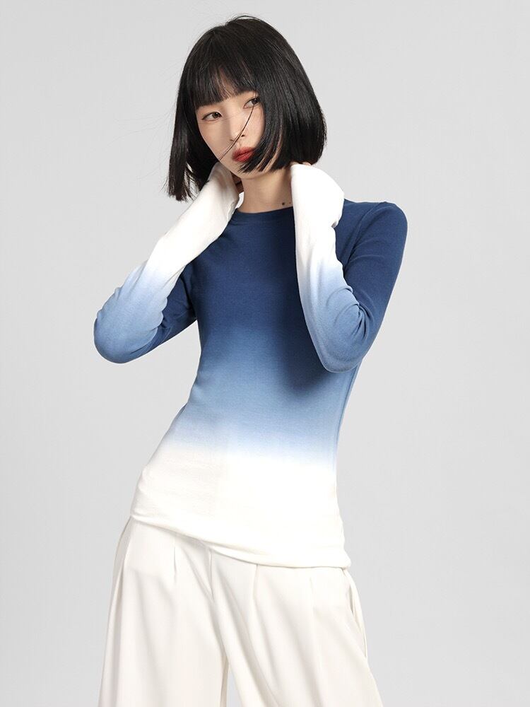 Pinkoz ファッショングラデーションブルー o ネック長袖 y2k スタイリッシュ Tシャツストリートシックカジュアルデイリートップスファムヴィンテージ traf ロング ピンク Oネック フェミニン ビンテージ