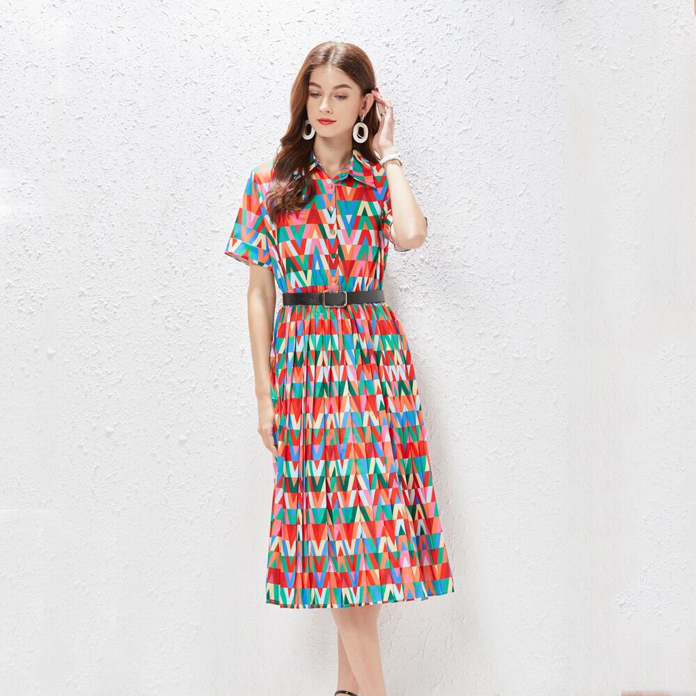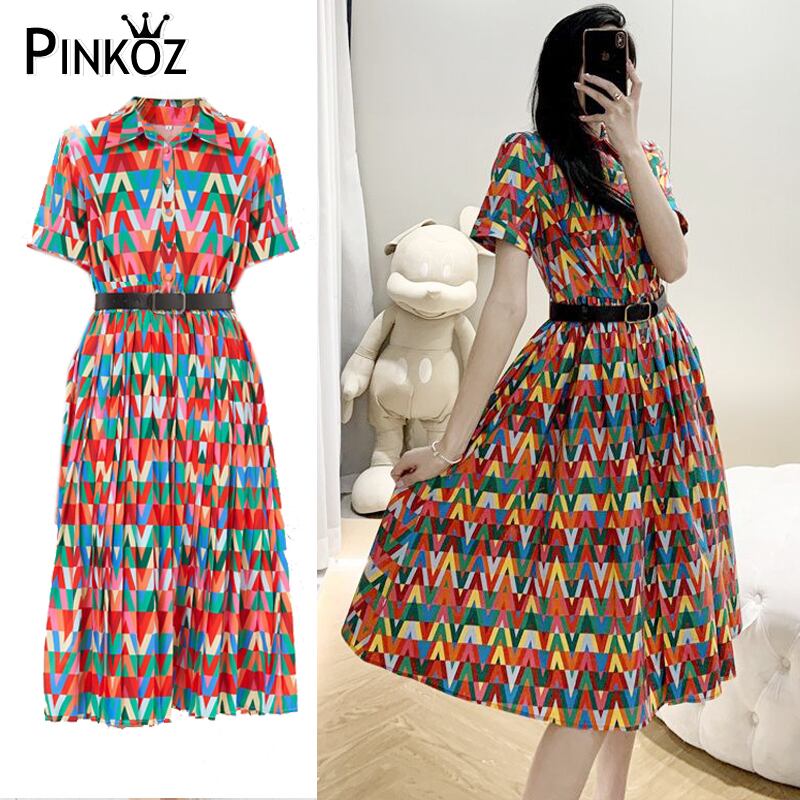 Pinkoz 春夏カジュアルミニドレスカラフル V 文字プリントターンダウン襟半袖プリーツドレス wqith ベルトシック ショート ピンク ハーフスリーブ スプリング 春物 サマー 夏物 ハーネス