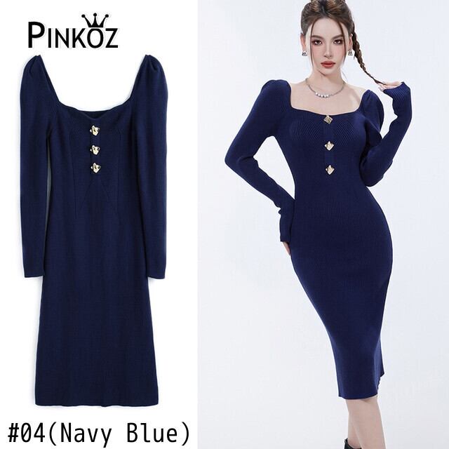 Pinkoz 滑走路デザイナースタイリッシュボタンスクエアカラーニットミディドレス fslimy シースパーティーナイト秋冬ドレス ピンク オータム 秋物 ウィンター 冬物 スクウェア